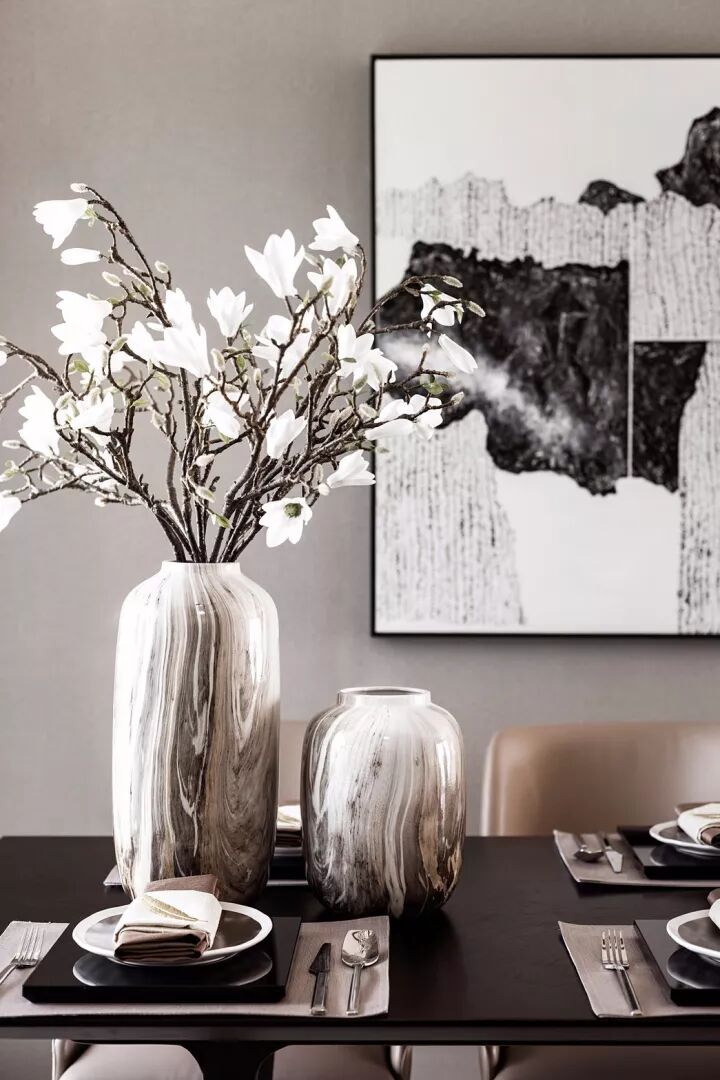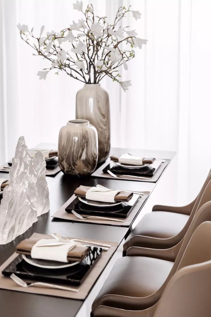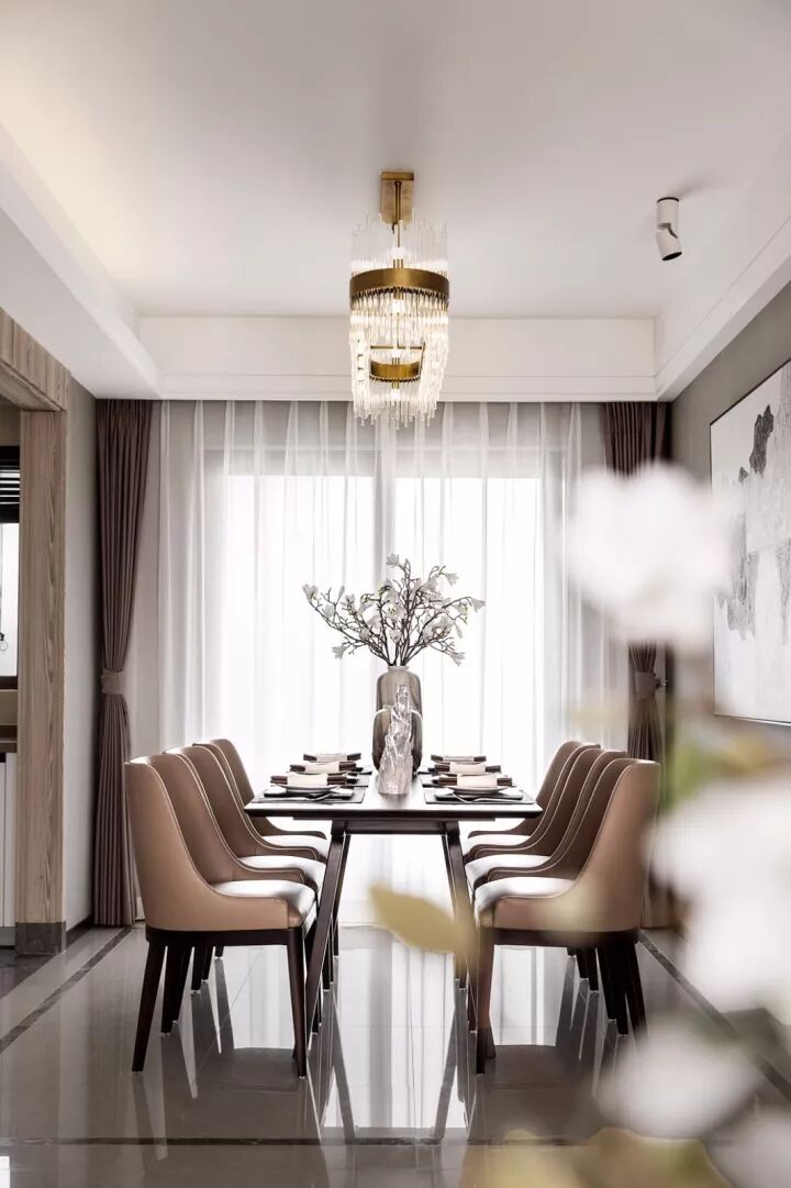 将灰褐色运用于空间设计中,搭配皮革餐椅、精致的艺术吊灯与新中式元素的饰品相结合,自然质朴、轻奢与温暖,为整个空间增添了华丽气息,尽显尊贵雅致,同时也提升了空间的居家氛围。