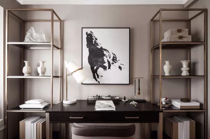 空间中整体色调较沉稳、优雅、别有韵味,能让阅读成为一件愉悦心性、陶冶情操的事情。两侧书架硬朗的金属材质,可以彰显时尚的质感。