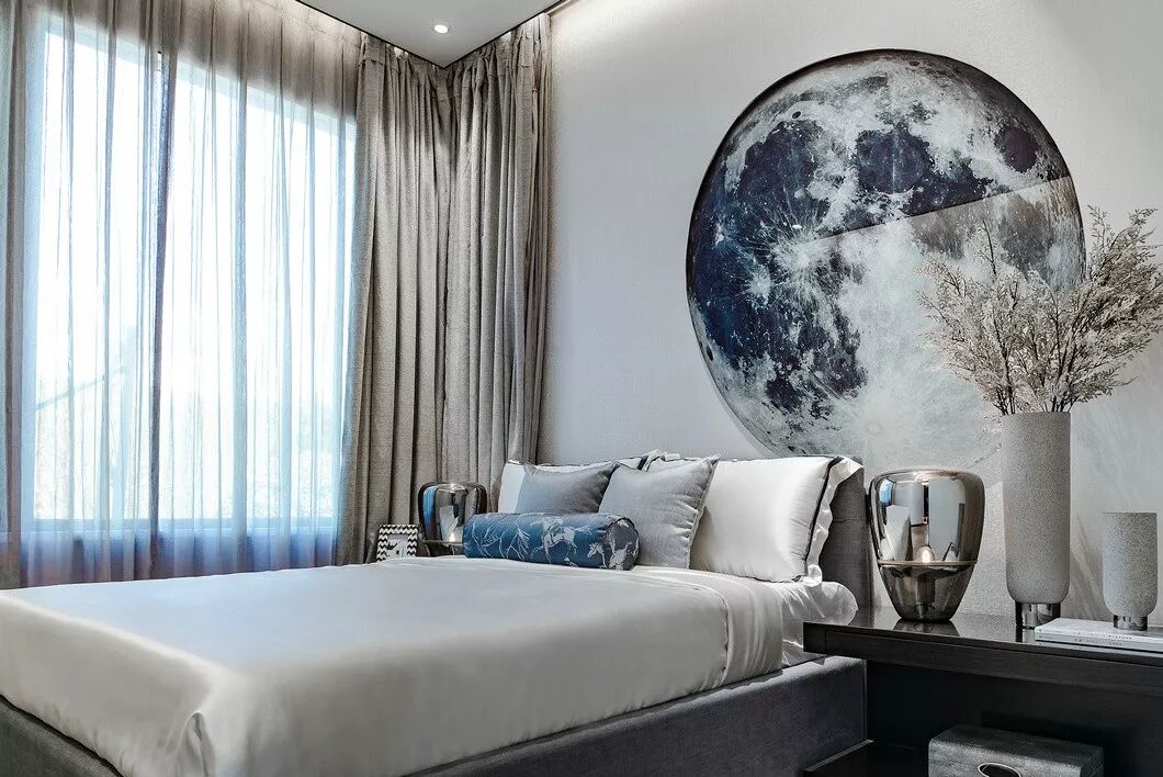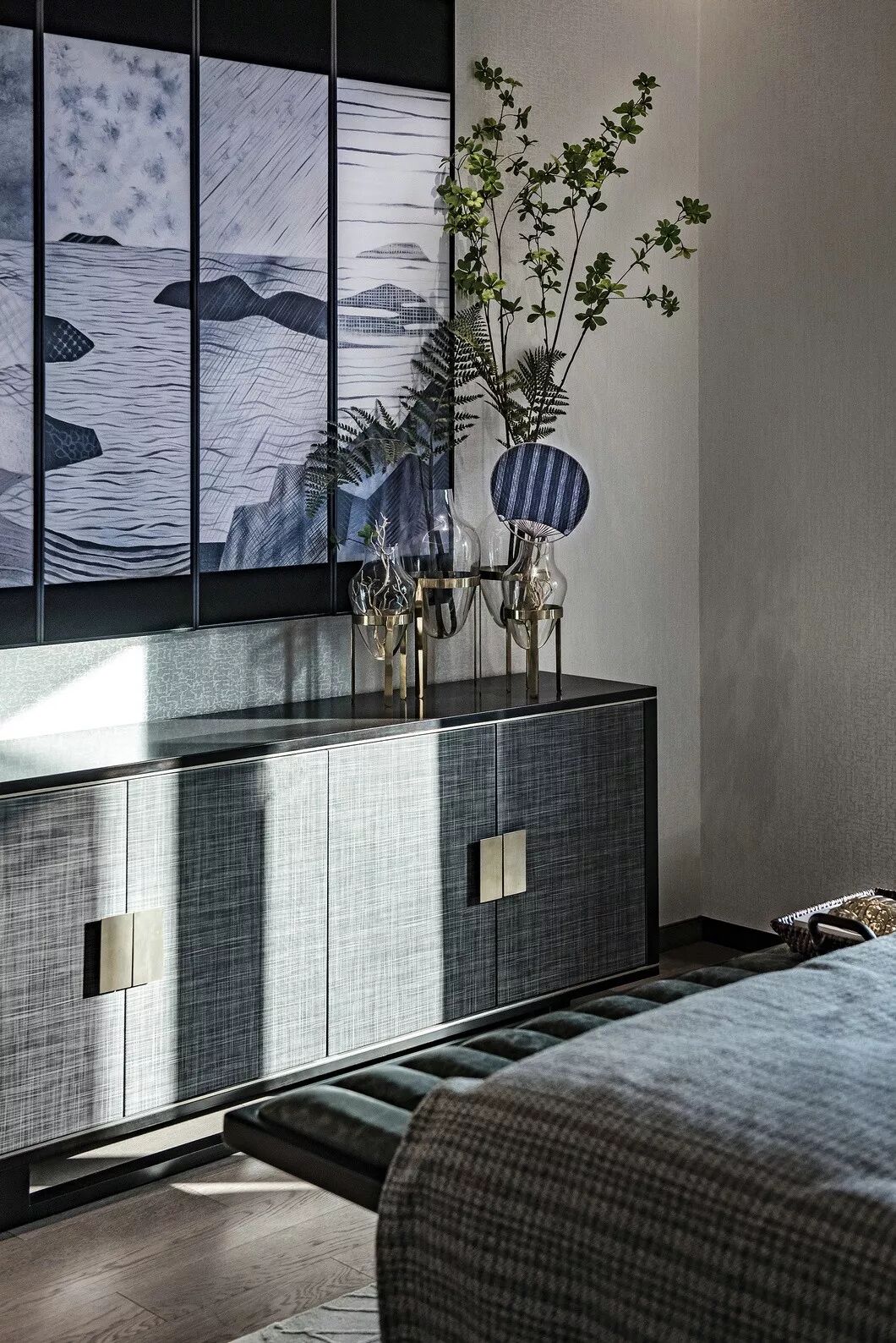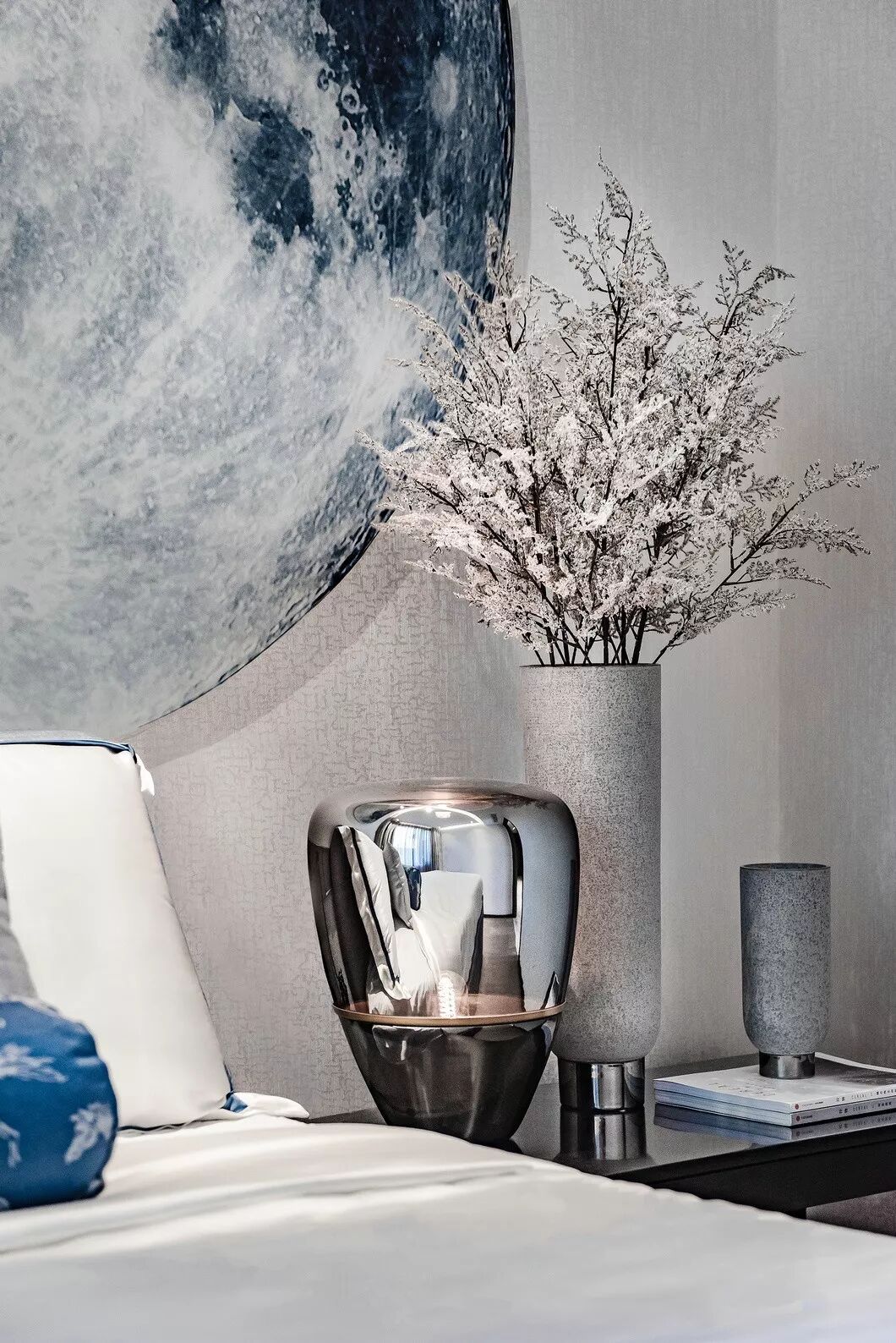 素白色的丝质床品上点缀靛蓝色的靠枕,与墙面的艺术装置相呼应;而花瓶的纹理则与墙纸互映。艺术装置写意月色的清雅,或是湖面的清冽,成簇的芦苇花在清风掠过时更显恬淡的氛围。