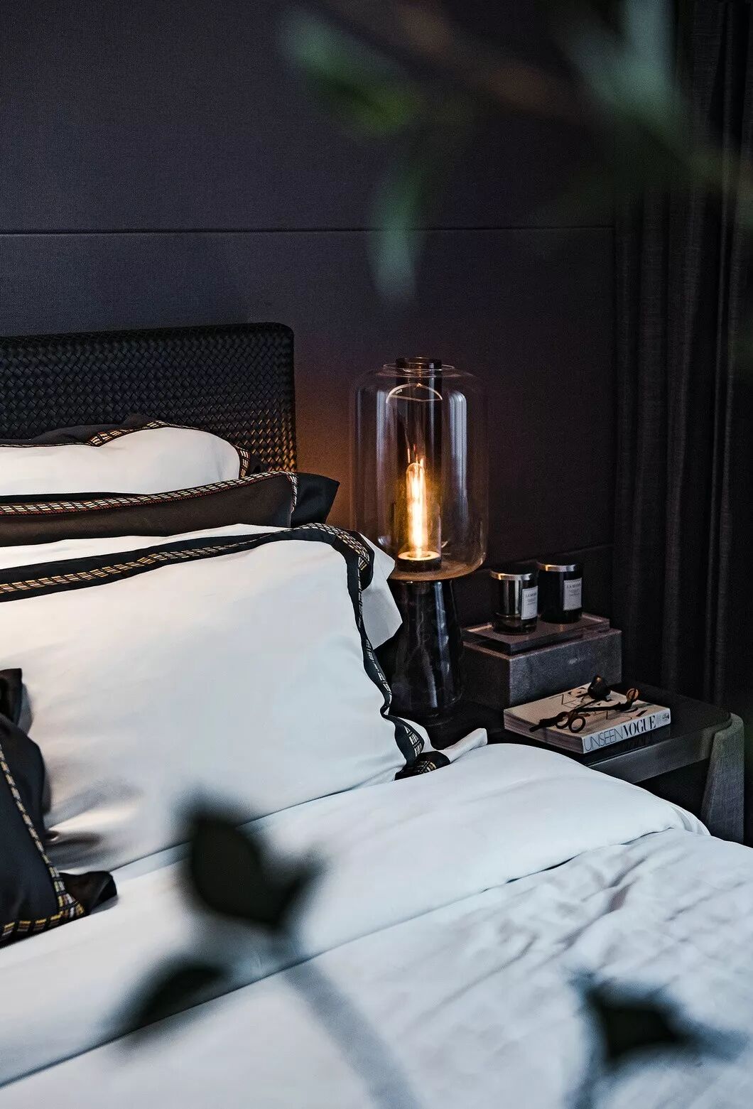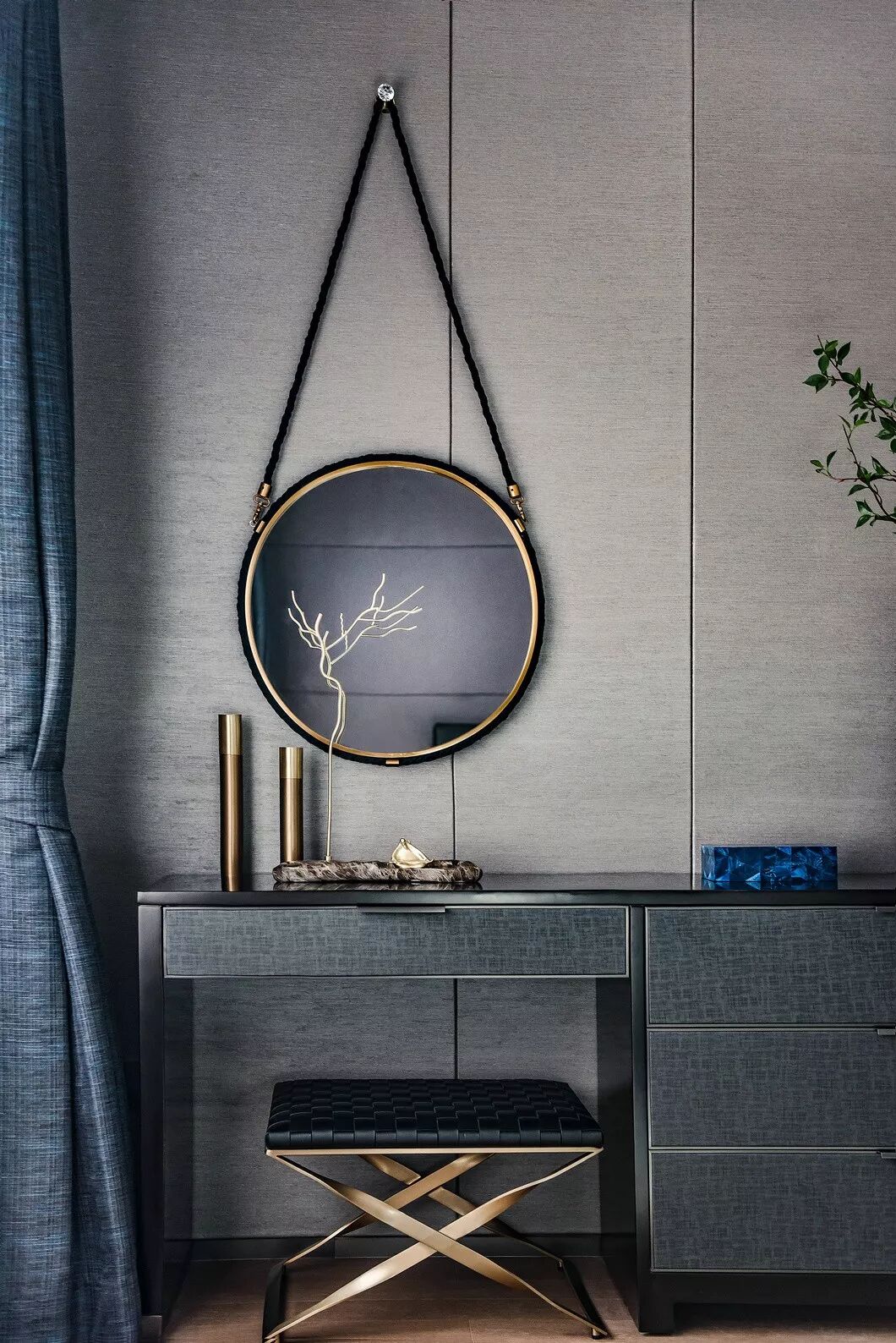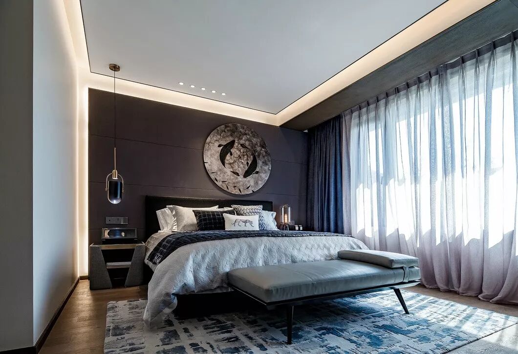 素白色的丝质床品上点缀靛蓝色的靠枕,与墙面的艺术装置相呼应;而花瓶的纹理则与墙纸互映。艺术装置写意月色的清雅,或是湖面的清冽,成簇的芦苇花在清风掠过时更显恬淡的氛围。