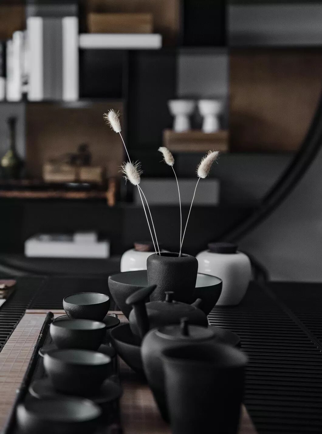 软装上将休闲空间与书法区、茶室做了细致的功能分离,既彼此独立又互相依存。松软的坐榻、纸上未干的字迹、排列有序的茶具、几只染白的兔尾草……设计在有限的空间内构建日常生活方式的诗性时间,安放居住者的灵魂与情感,这个诗性时间是循环的、永恒的、私人的、静谧而安然的。