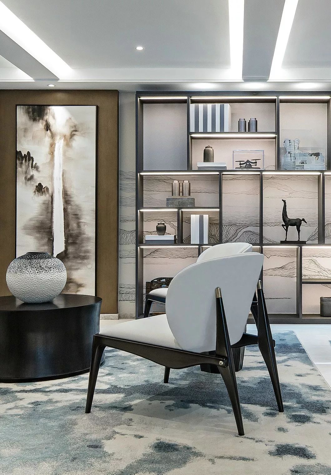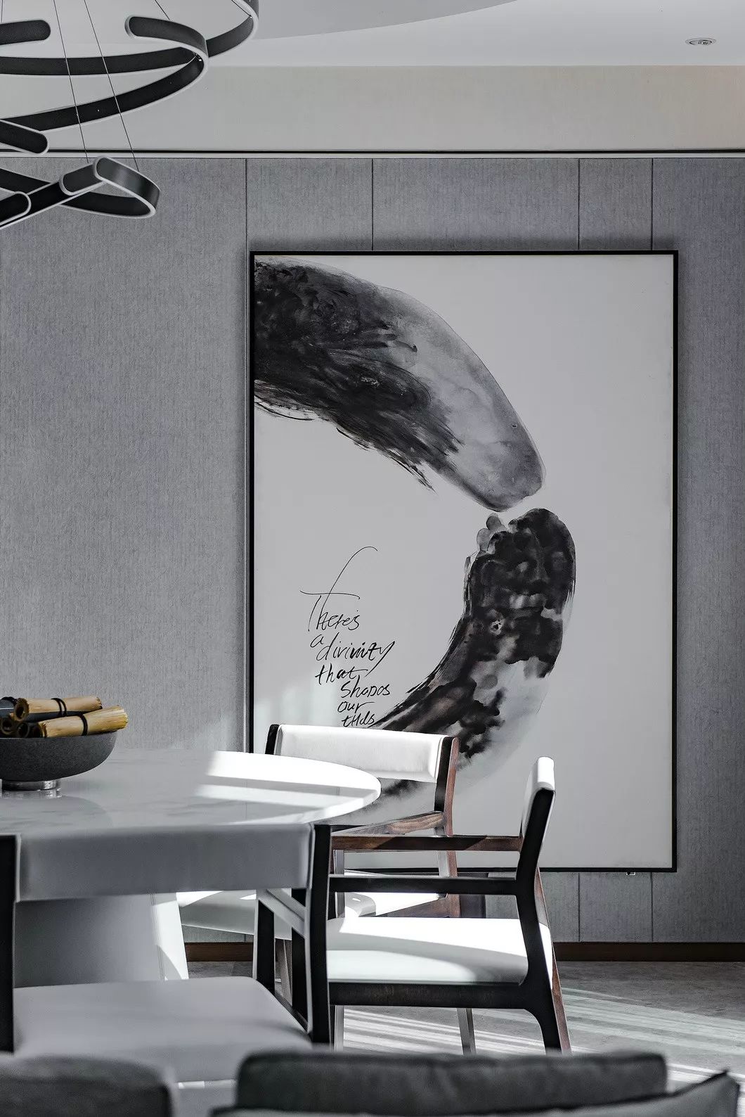 几何艺术吊灯、简净的家具形制,营建空间的当代美学格调,而一旁的巨框水墨画作突出东方笔触,颇显意境。