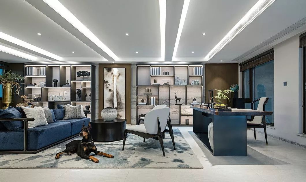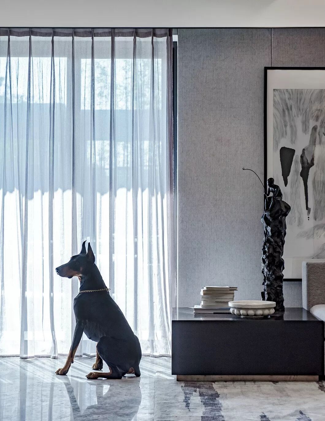 设计师的眼睛,是藏在日常生活背后的打量与思索。设计师将敏捷聪慧的杜宾犬带进空间内,想象宠物与主人之间亲昵玩耍的场景,既匹配城市雅贵的睿智风貌,又显露着生活空间里的温情与愉悦之感。