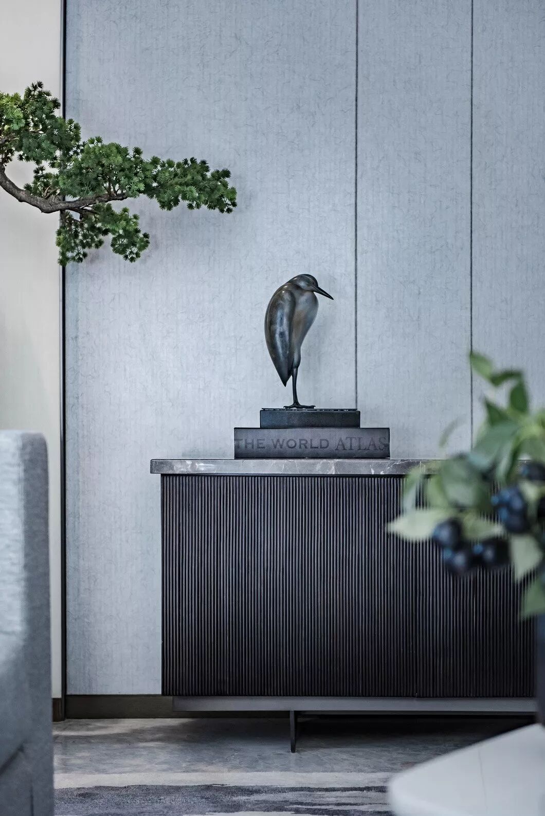 看似低调冷艳的雾霾灰在材质转换的加持下,为空间带来一丝温存与高雅之感,串联起室内的情感主线。墙上的挂画写实刻着岁月痕迹的树皮纹理,而垂钓者的雕塑、精致的鸟笼、旅行时淘回来的木雕,空间内这些错落有序摆放的小品,都透着日常的味道,朴实无华。