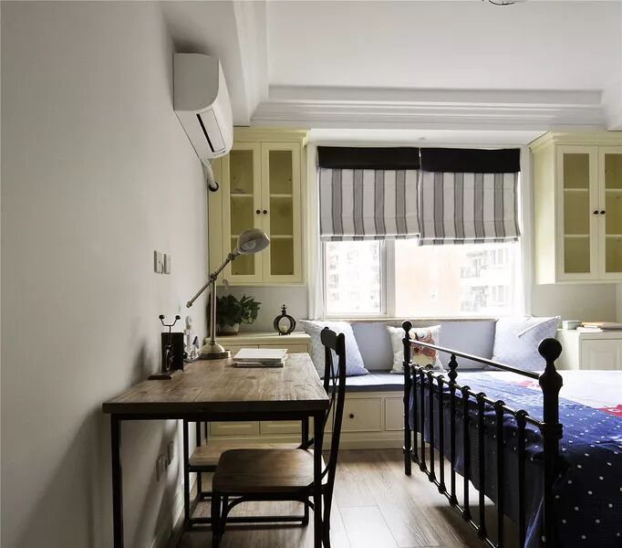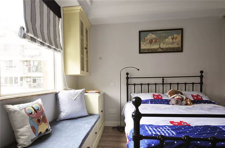 儿童房的床尾还摆放了一张大书桌,这样孩子平时做作业也方便一些。靠窗的地方也做上了假飘窗,两侧的柜子让儿童房拥有更多储物空间。