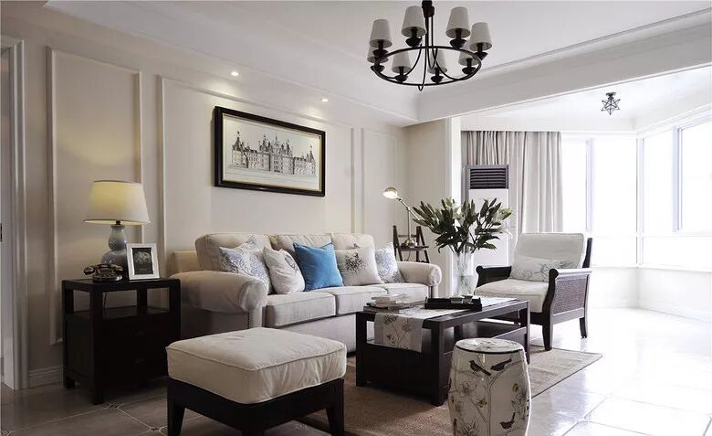 餐厅和客厅之间用走廊作为隔断,沙发背景墙刷成了暖白色,搭配石膏线装饰边框和挂画作为点缀。浅色调的布艺沙发和背景墙结合起来,更有整体感。