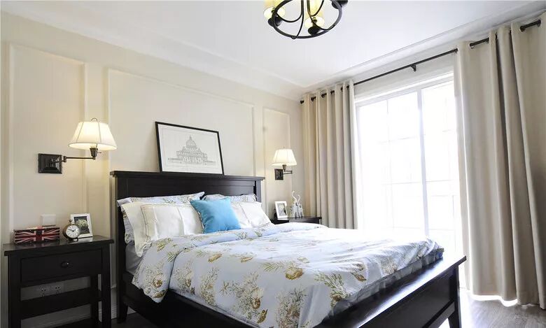 主卧室的背景墙延续了客厅的配色,窗帘也选择了素色的,看起来更加温馨舒适。床头对称的壁灯和挂画装点了这个卧室。