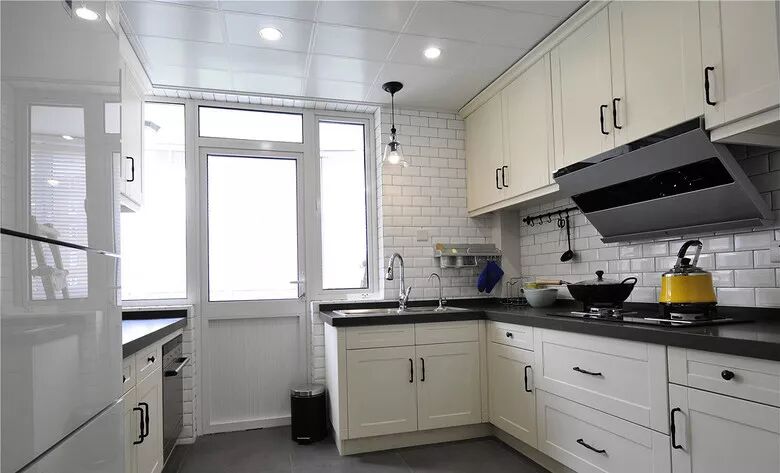 厨房外还有个小阳台,所以橱柜做成了L形加一字形的设计,黑白灰三色的使用,让厨房看起来简洁大方而又层次分明。