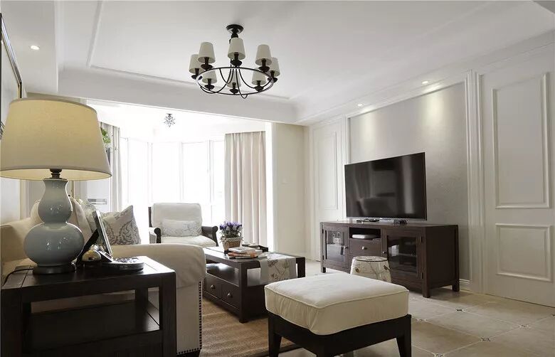 客厅的电视背景墙也是用石膏线做了边框,深木色的电视柜和茶几都是挑选了美式风的,给客厅带来了更为沉稳、大气的感觉。