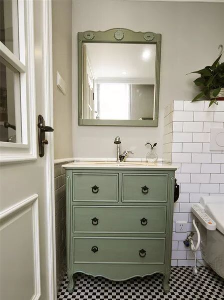 很喜欢卫生间内的这个洗手台,款式复古又可爱,卫生间干区的墙面上方刷上了乳胶漆,和黑白色的地砖、小白砖形成对比,更有层次感一些。