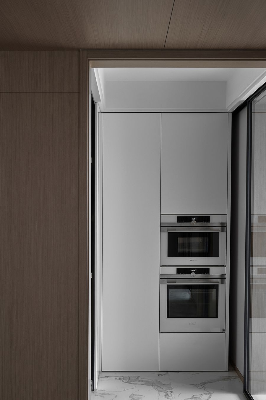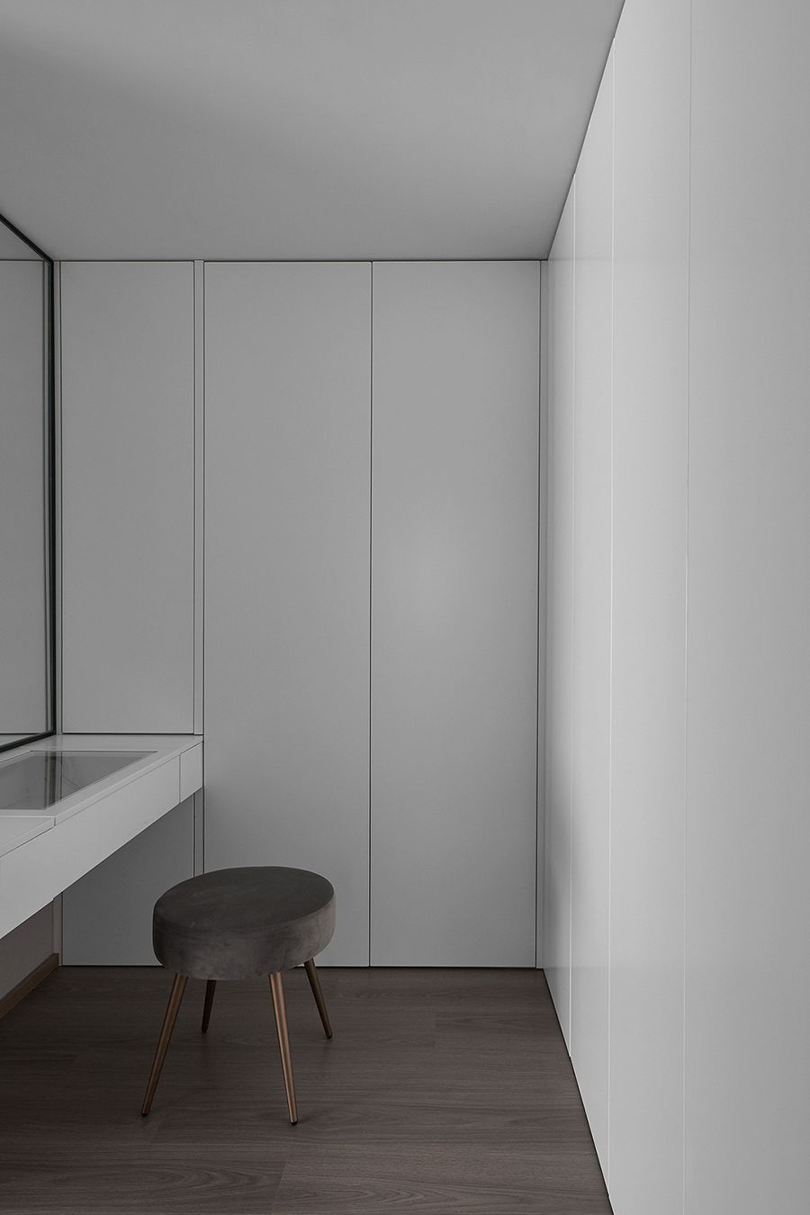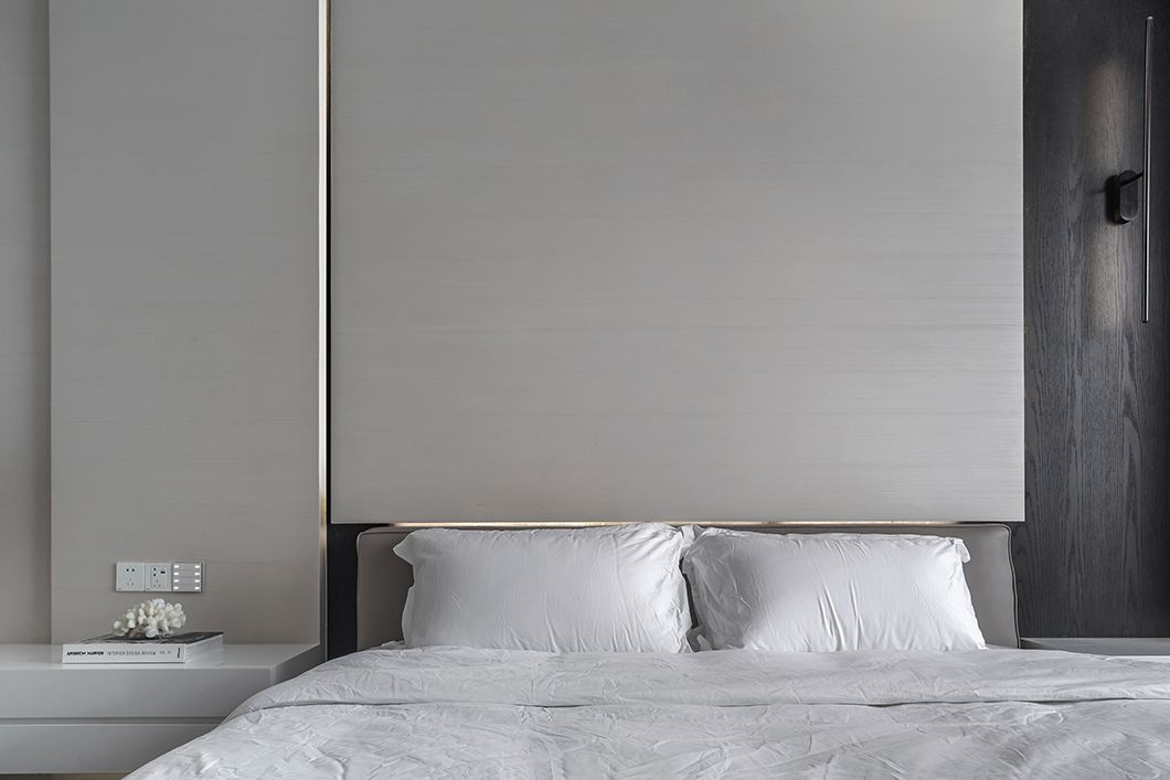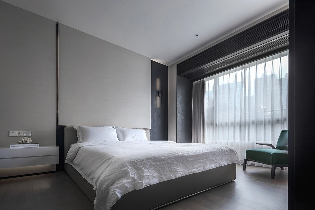卧室的设计上注重利落静雅,大面积的白色柜体展现了空间张力,配合挑高大块的玻璃窗景,提升空间明亮度。
