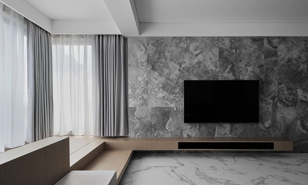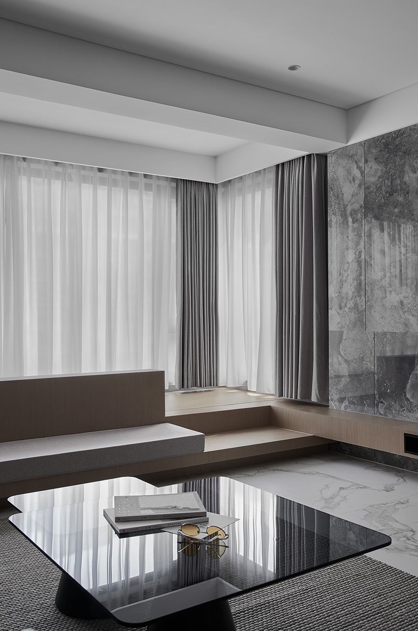 我们将电视背景墙立面造型拉平,延伸材质致使轴线延长,将空间视觉感达到超大化。我们大量使用暖色系,中和了空间彩度,以石材、木纹、艺术涂料等材质,通过大块的落地窗景,藉由光影虚实的变化,创造出安定雅致的居住氛围。