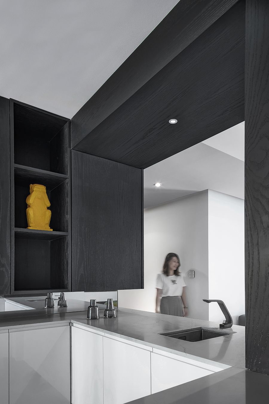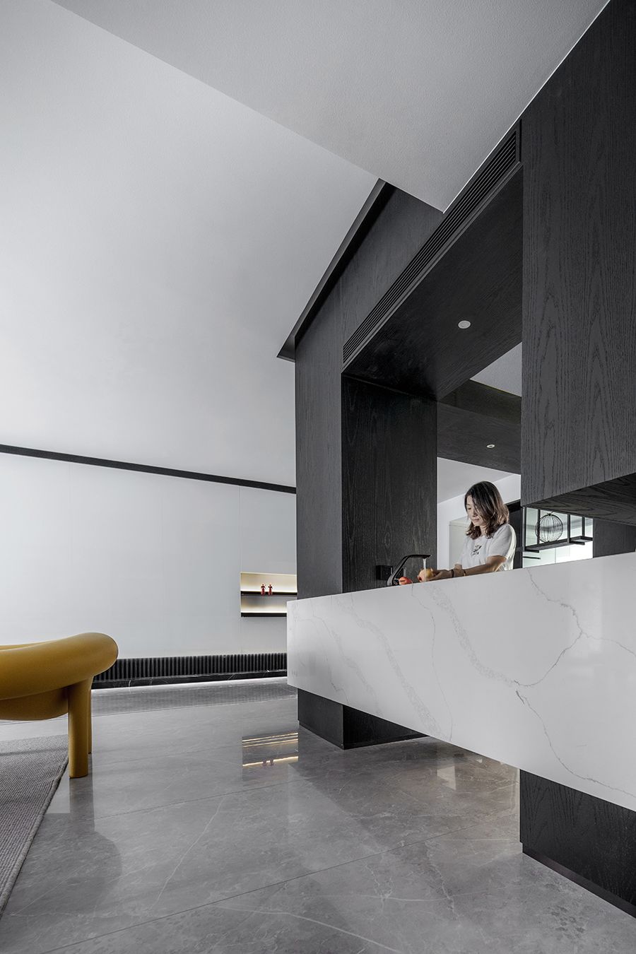 中岛台以建筑的手法出现,交扣组构,与垂直动线的客餐厅、吧台,形成整体的连贯,让空间与人产生自然的互动,呈现惊喜的体验,享受空间居所的互享。