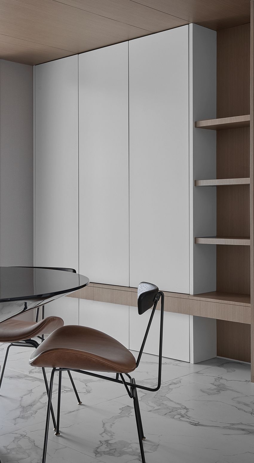 因为男业主非常注重居家环境安全,为避免餐桌锐角,创造孩子在餐厅玩耍的安全空间,所以在简洁利落的餐厅区,我们规划了业主喜欢的圆形餐桌形态,并搭配雅致的皮革餐椅,透过大面北阳台自然光的引入,让业主和孩子们于空间中也能享受生活的慢步调。
