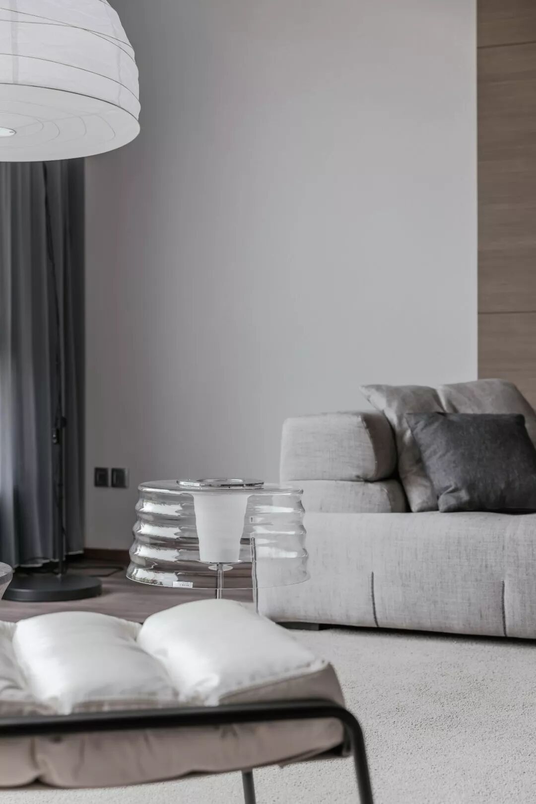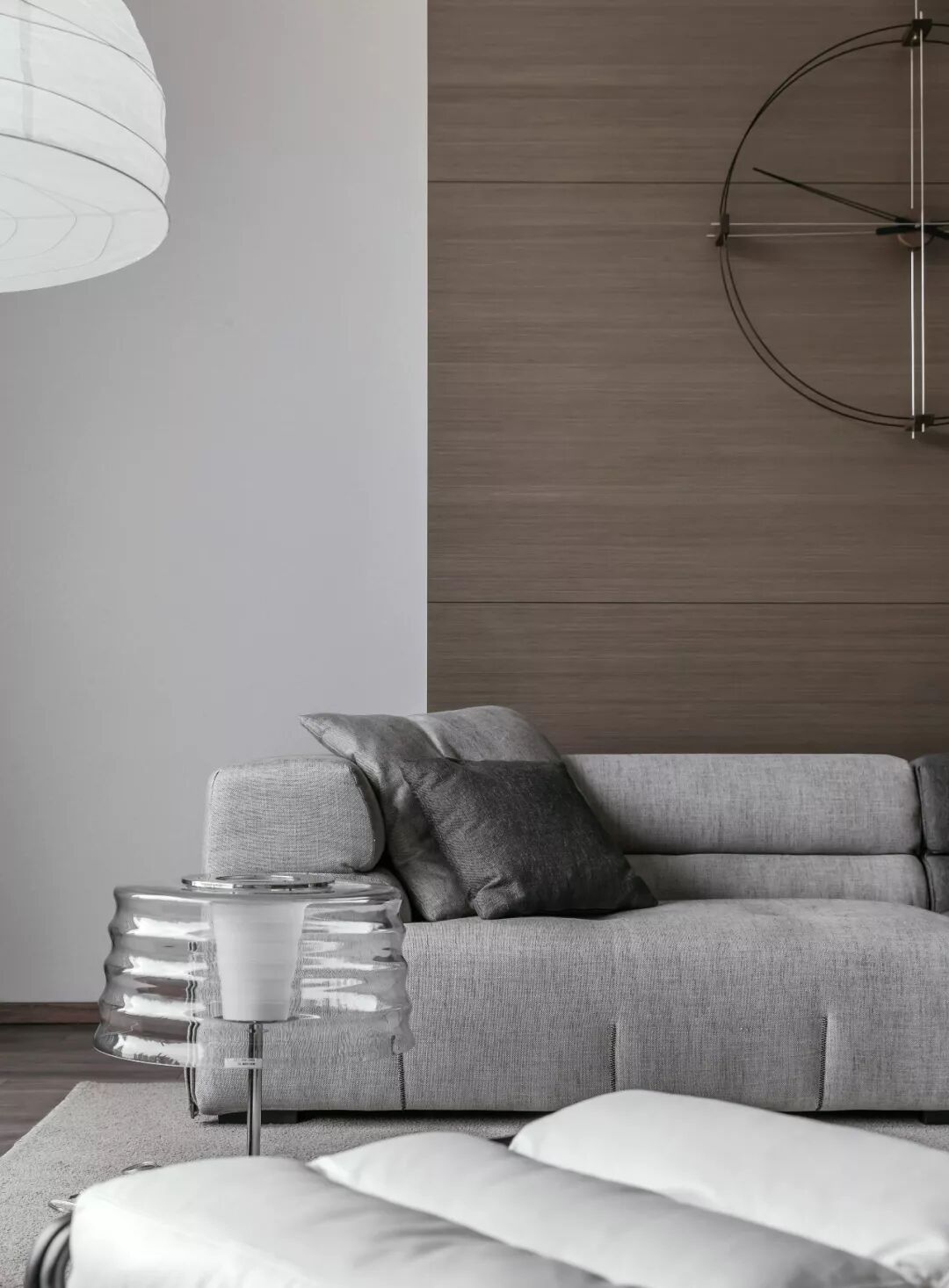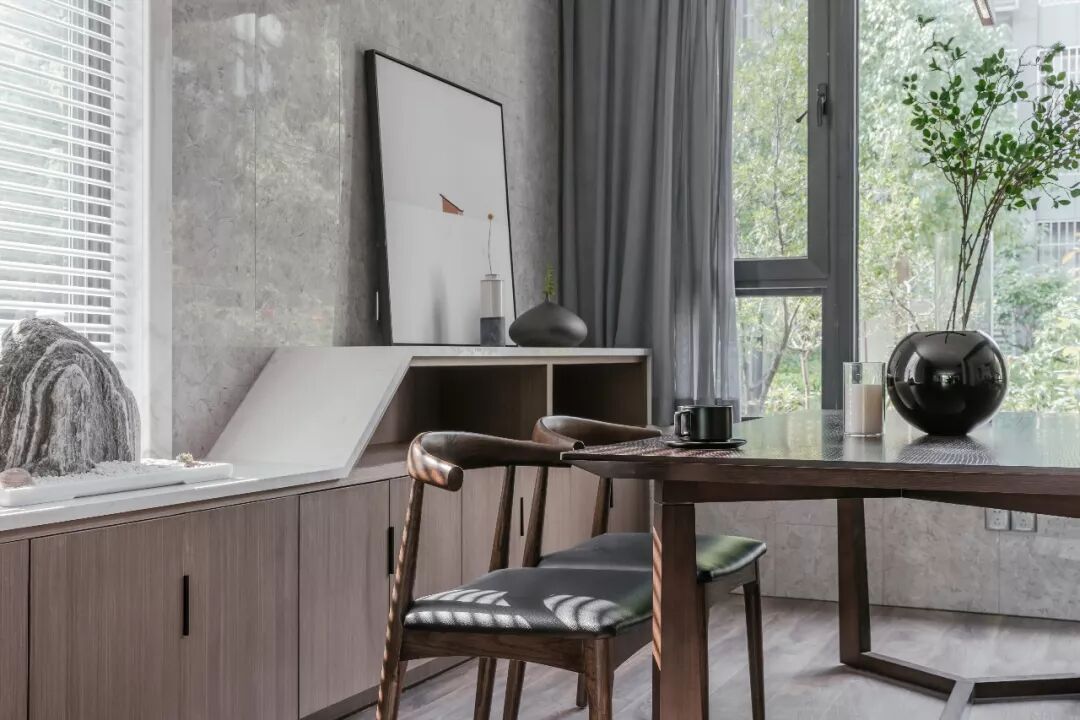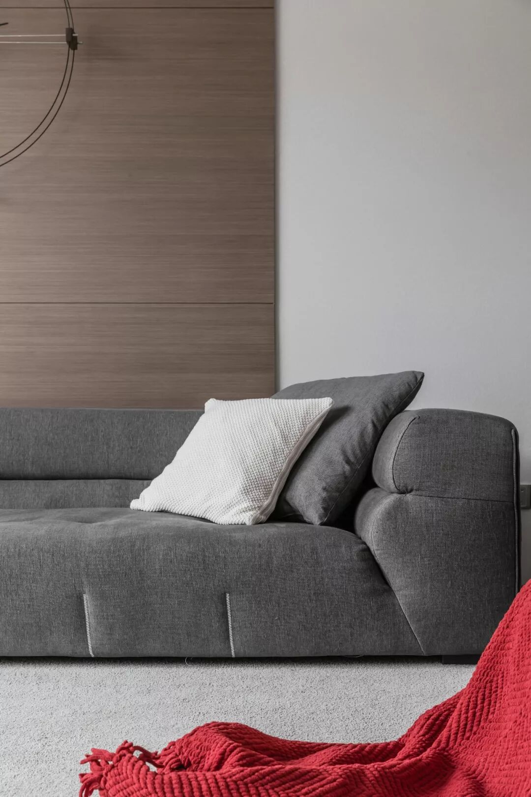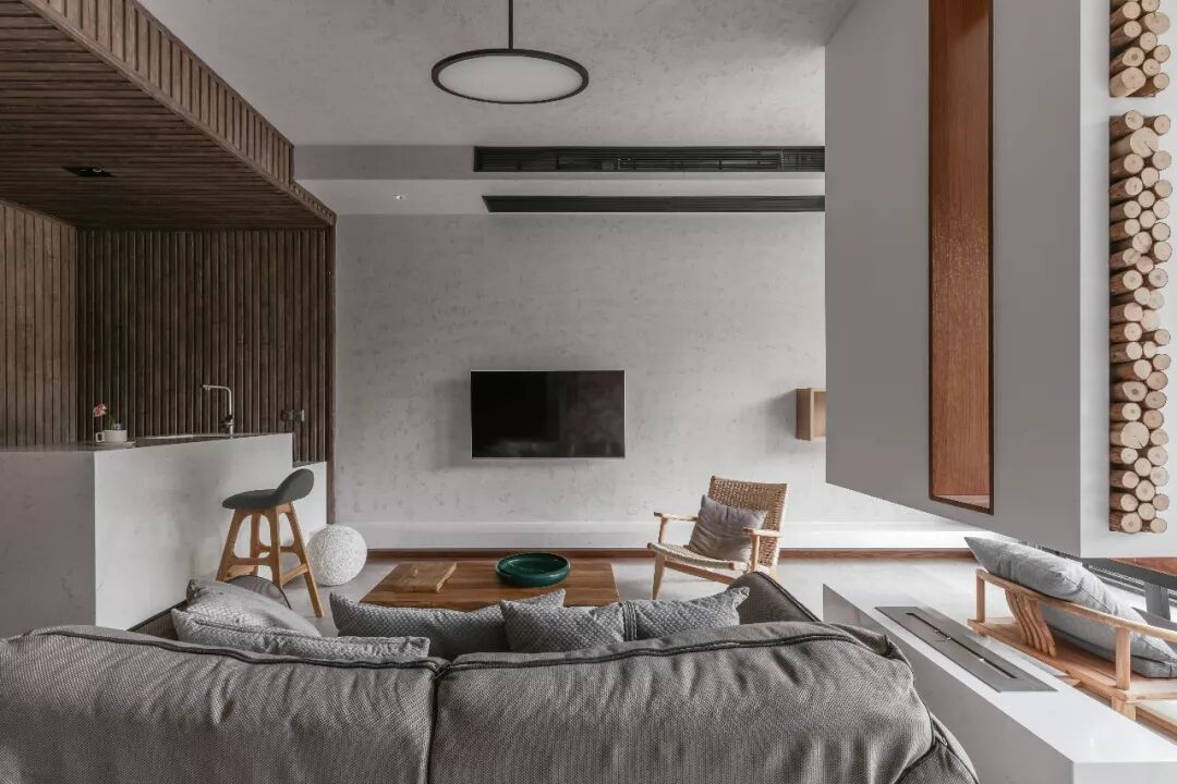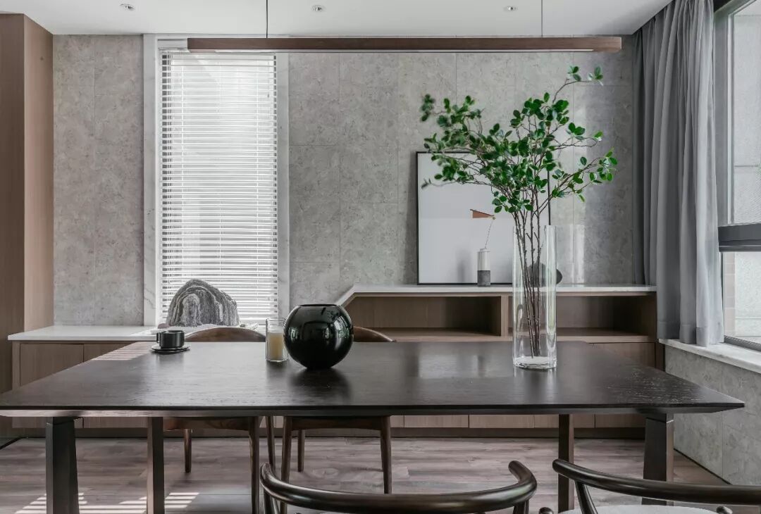 灰色创造了光洁简约的空间表面,再加入木作、布质家具,透过纹路、肌理散发出自然简约的侘静质感,整体画面保持纯净整洁,给业主生活增添素雅开阔的视野之美。