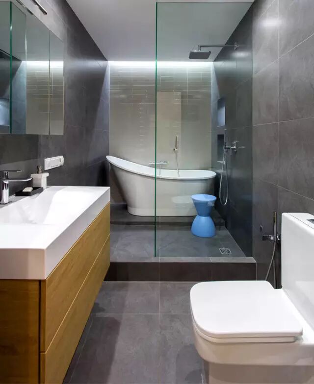 长条形卫生间布局很简单,无非是淋浴(浴缸)、台盆、厕所的排列组合。