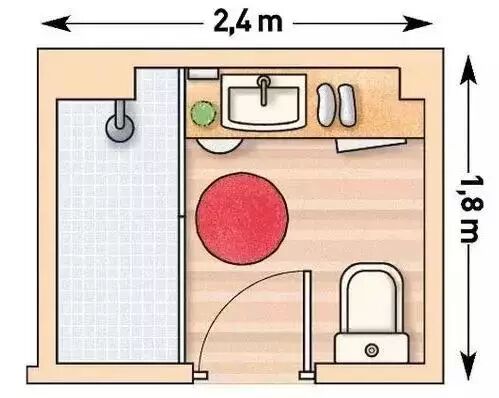 正方形布局最常见的就是除了开门区间,剩下三只角被瓜分为洗手池、马桶和淋浴间。