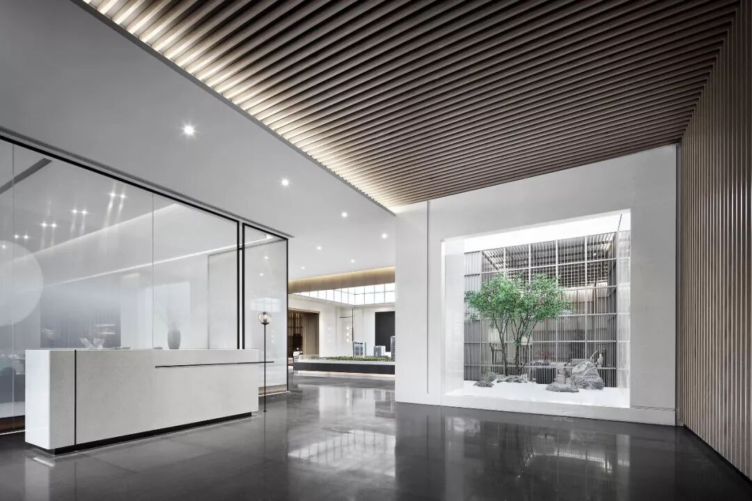 另一侧的引景入室,设计师为来访者创造的一场生命感的邂逅。被设定的天空产生的光和影,与彼时灵动线条、禅心明月,树影斑驳交相辉映,平增一份雅趣。