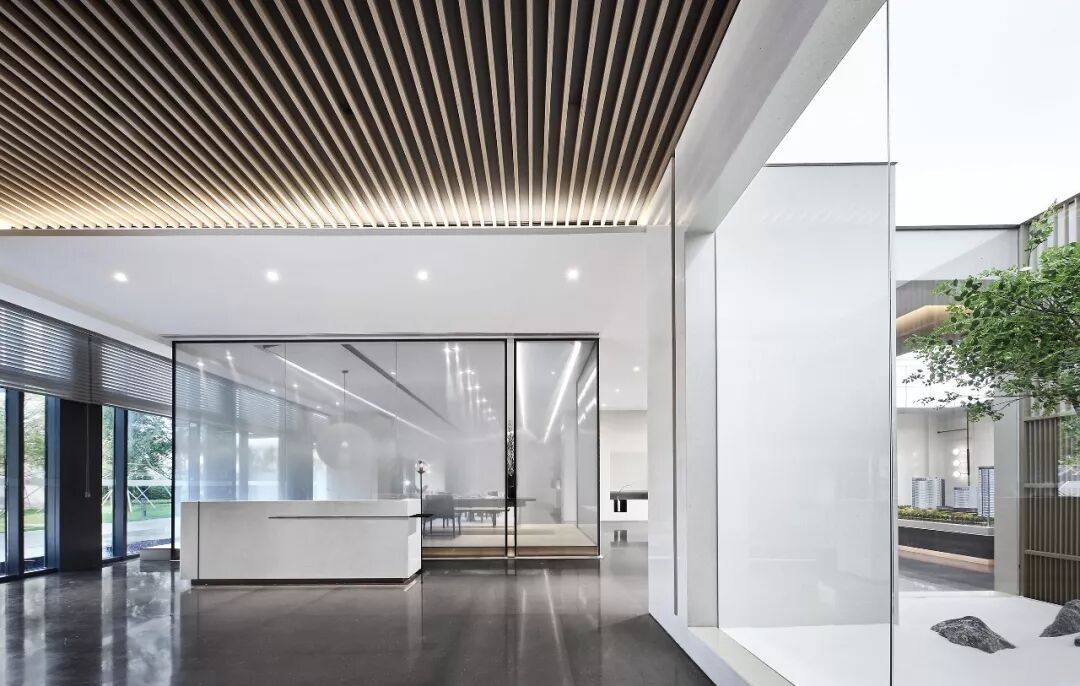 元素的选用,是体现整个方案的初始。模型区一改往常的繁华,选用繁密且律动成韵的木格栅,每一条横平竖直的天花线条,最大程度上联系了人与自然,独立又相融。