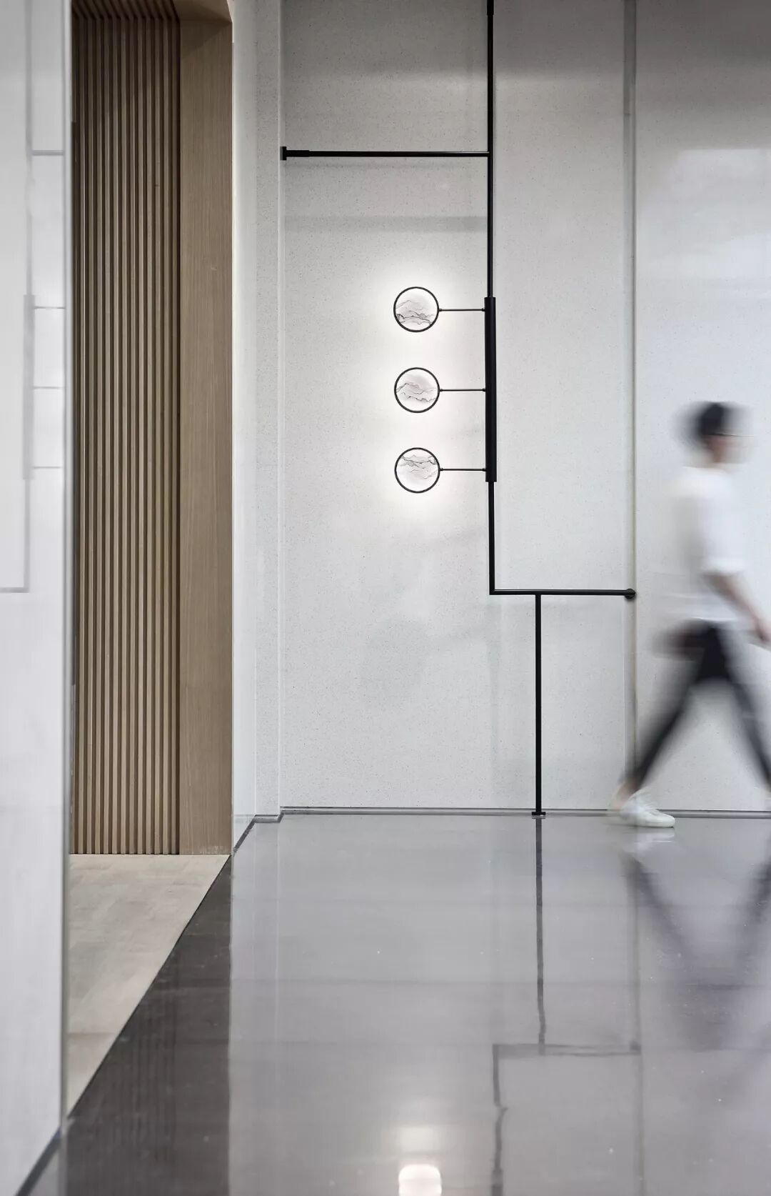 游廊,方见深远而圆。明月的象征性元素——圆,被运用在过道的各处。与长长的廊道相映,方中有圆,形成一种空间的平衡与补充。