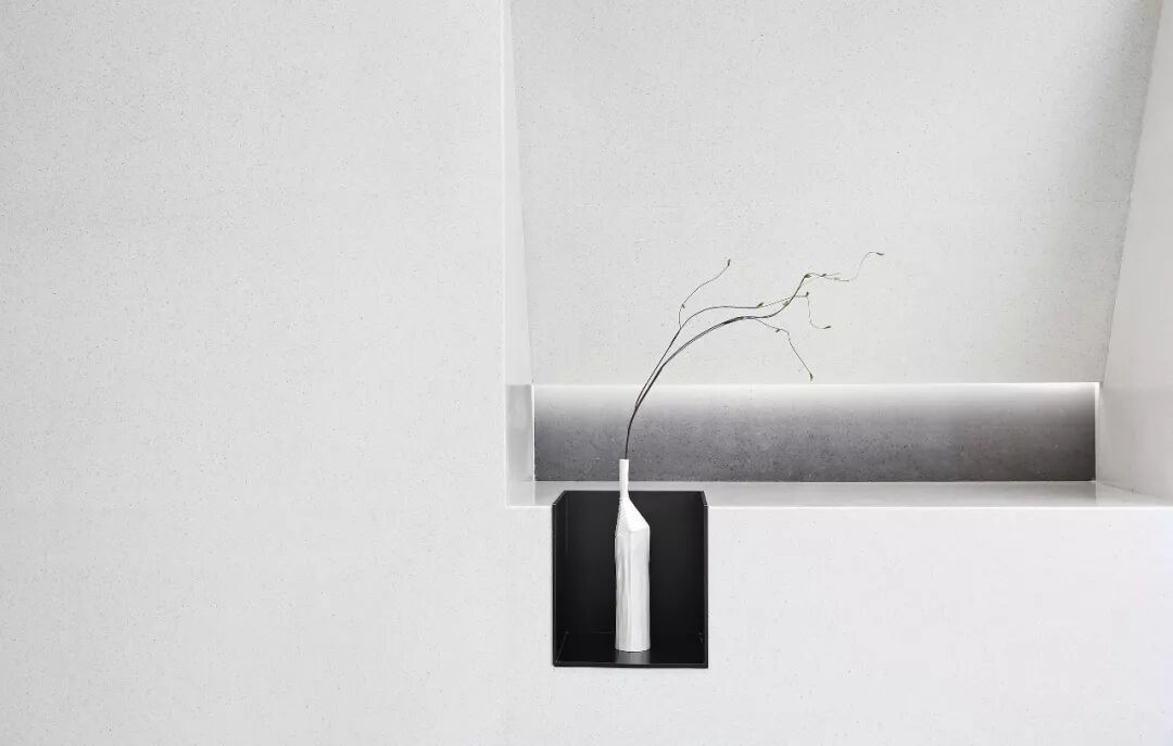 折角、切割、延伸……融合当代建筑设计语言,通过材质与线条的切换,由浅至深的色块理性组合,层层递进,搭配斜顶天花下灵动变幻的光束,营造出纯净雅静的空间气息。