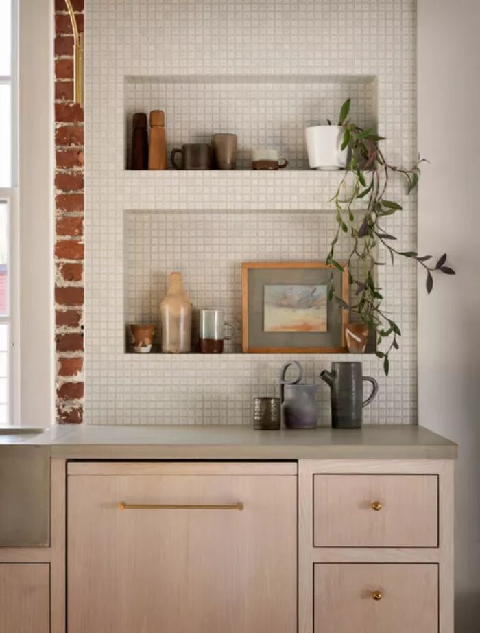 你会发现,马赛克是奶油色的,各种瓶瓶罐罐是棕色系的,和整体保持一致。设计师连这种小细节都没放过,真的很nice。