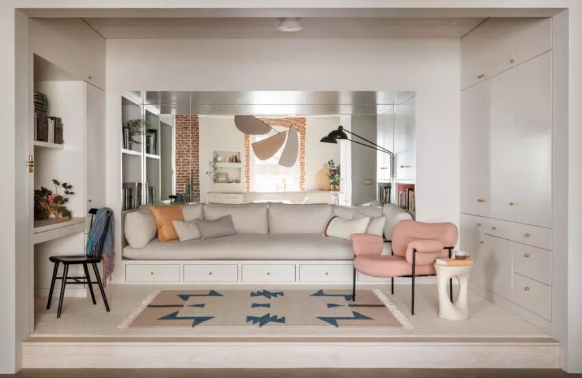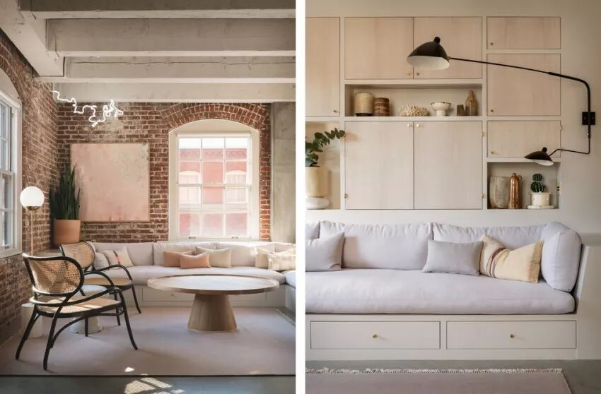 大量中性低色彩系在公空间堆叠,如浅粉矮背沙发、樱花粉休闲椅、浅棕木桌等带有圆润弧线的家具…包括一侧沙发后的收纳柜门。