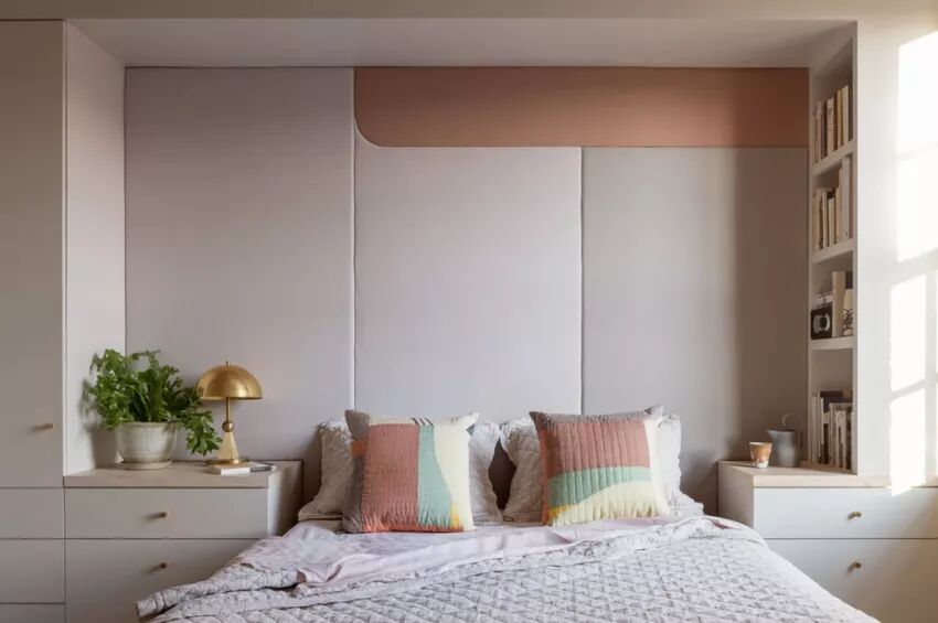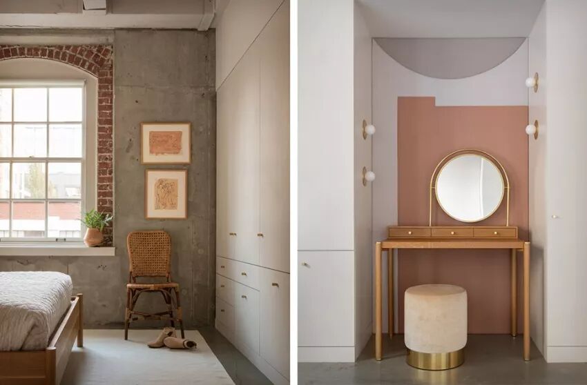 同时,利用衣柜和入口处的墙,做了一处梳妆区域。把莫兰迪的脏粉和灰色在小景处刷出有趣的图形,这点确实可以作为借鉴。