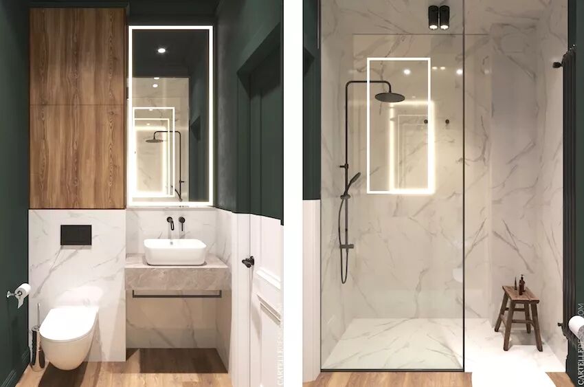 围绕着独立洗手间的四面,都做了一整圈的收纳柜,如果做工精巧,从外观上看就如同一个盒子一般。