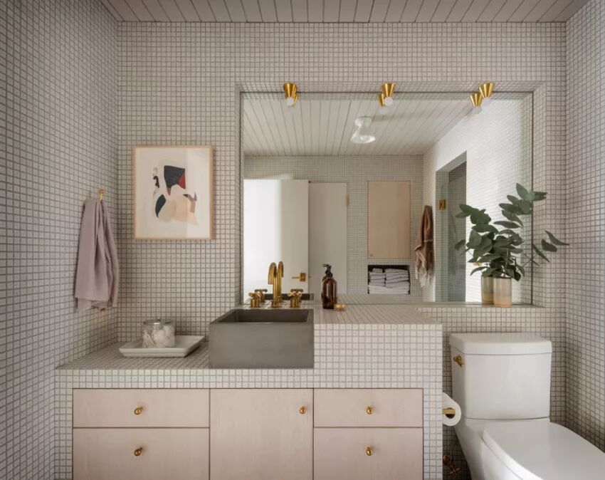 卫生间的使用的元素,我们在公共空间里已经见过了。同样的配方。
