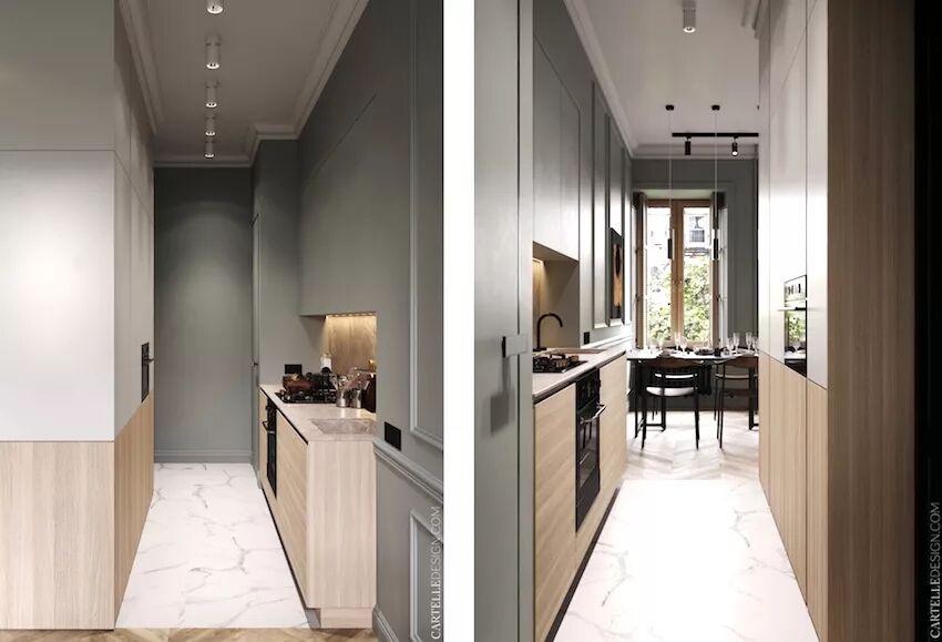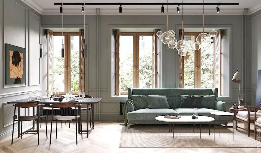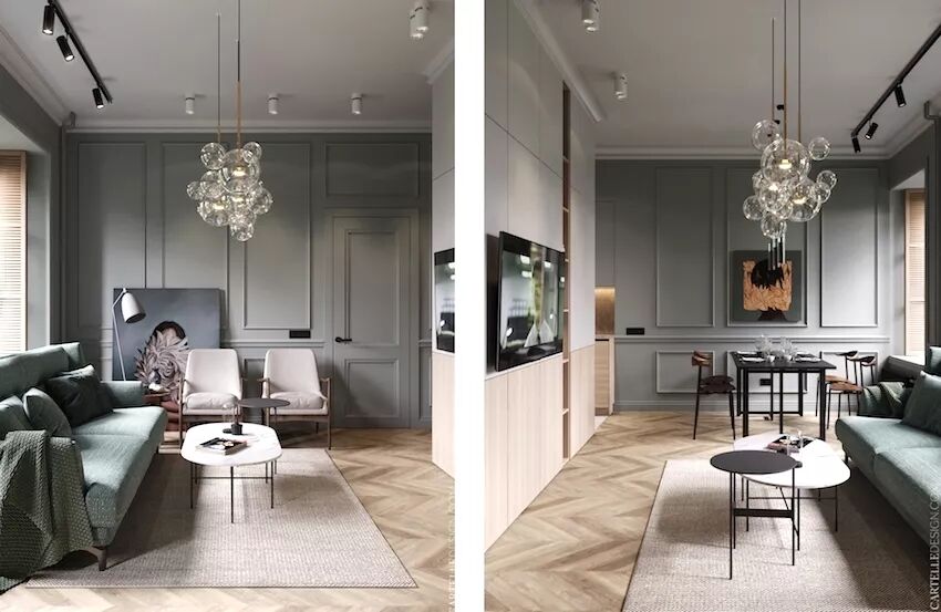 下面这套俄罗斯公寓里的灰绿色+古典精致线板,走得是更为都市的风格。