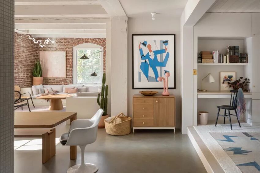 以走道为分界线,左侧是餐厅+开放厨房,右侧是开放式书房,一个斗柜+装饰画立于尽头。