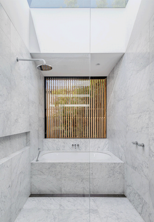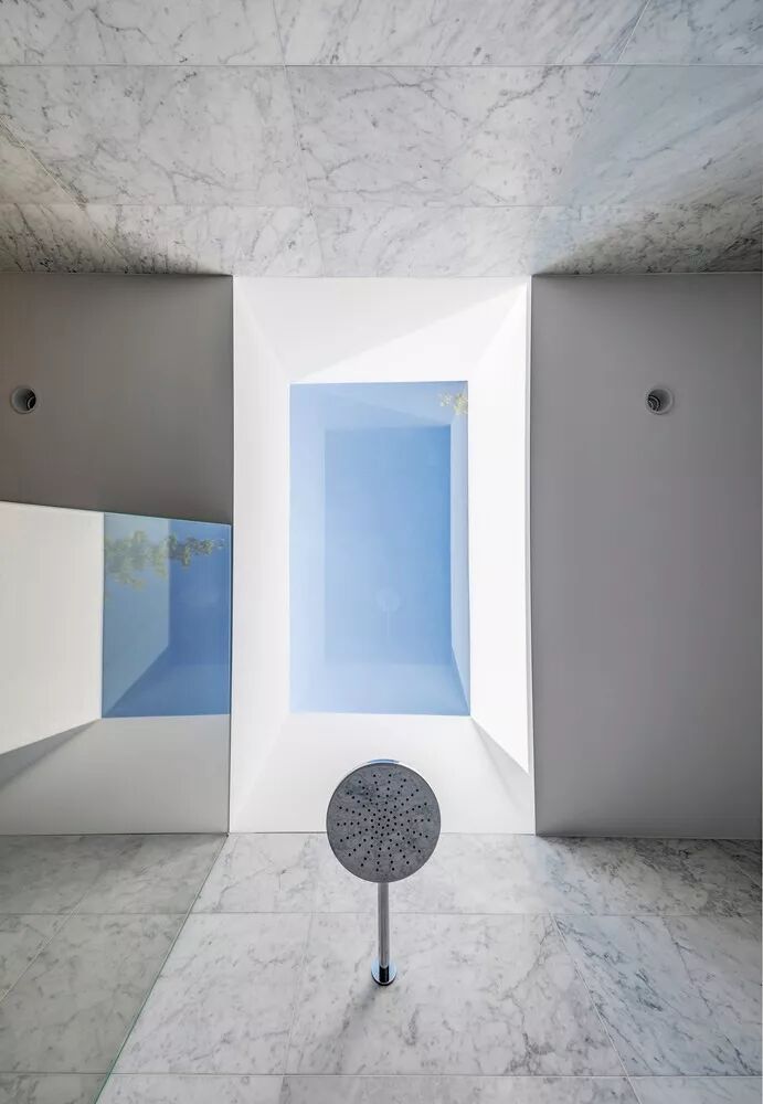 淋浴区的墙壁用大理石瓷砖铺贴