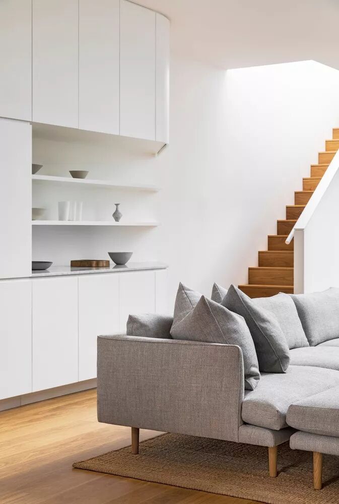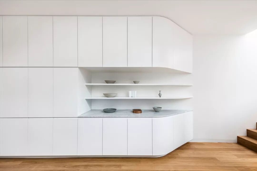 白色的橱柜延伸到楼梯口