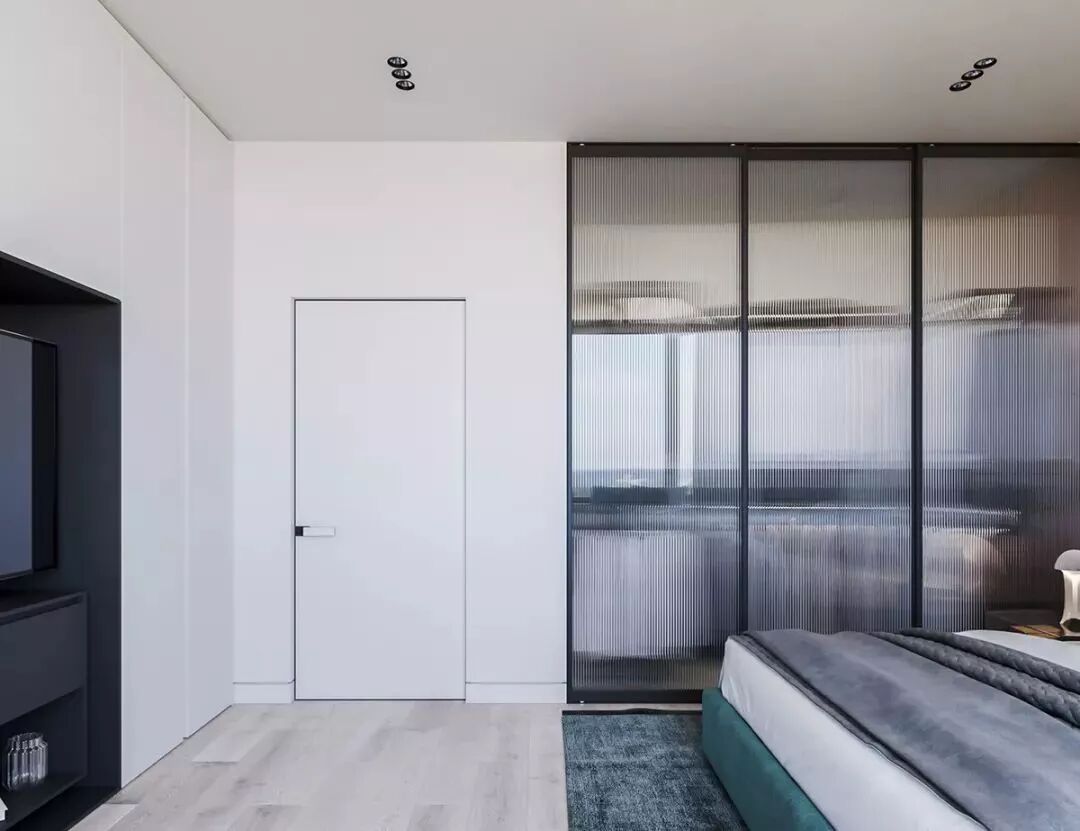 卧室里一些不规则空间的死角位置,其实可以利用起来,做成定制衣橱,加上玻璃推拉门,瞬间整个角落高级感十足!