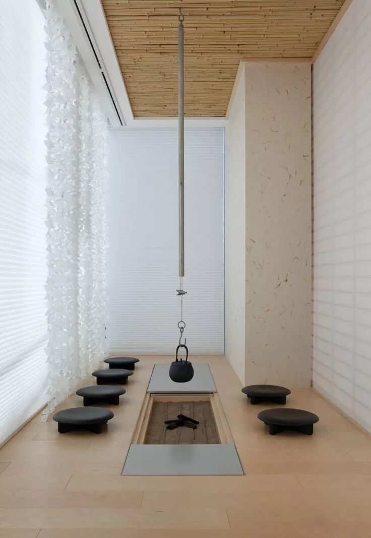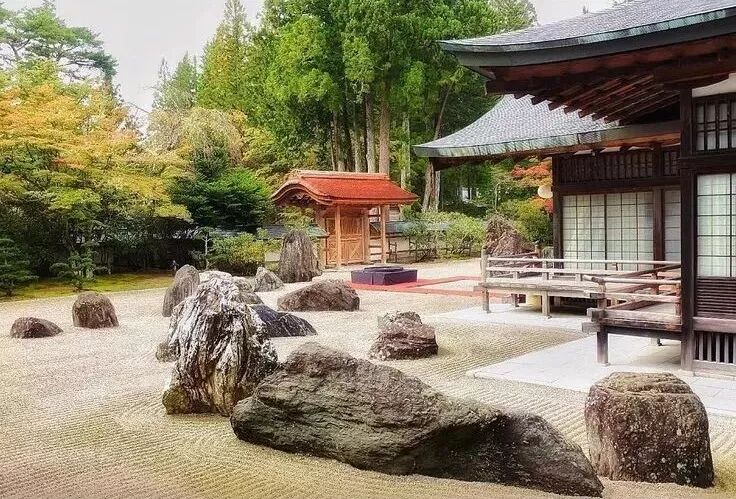 枯山水又称假山水,是日本园林独有的构成要素,并逐渐引入室内设计中。枯山水用石块象征山峦,用白沙象征湖海,用线条表示水纹,如一副留白的山水画卷。在其特有的环境气氛中,因其无水而喻水,因无山无水而得名。