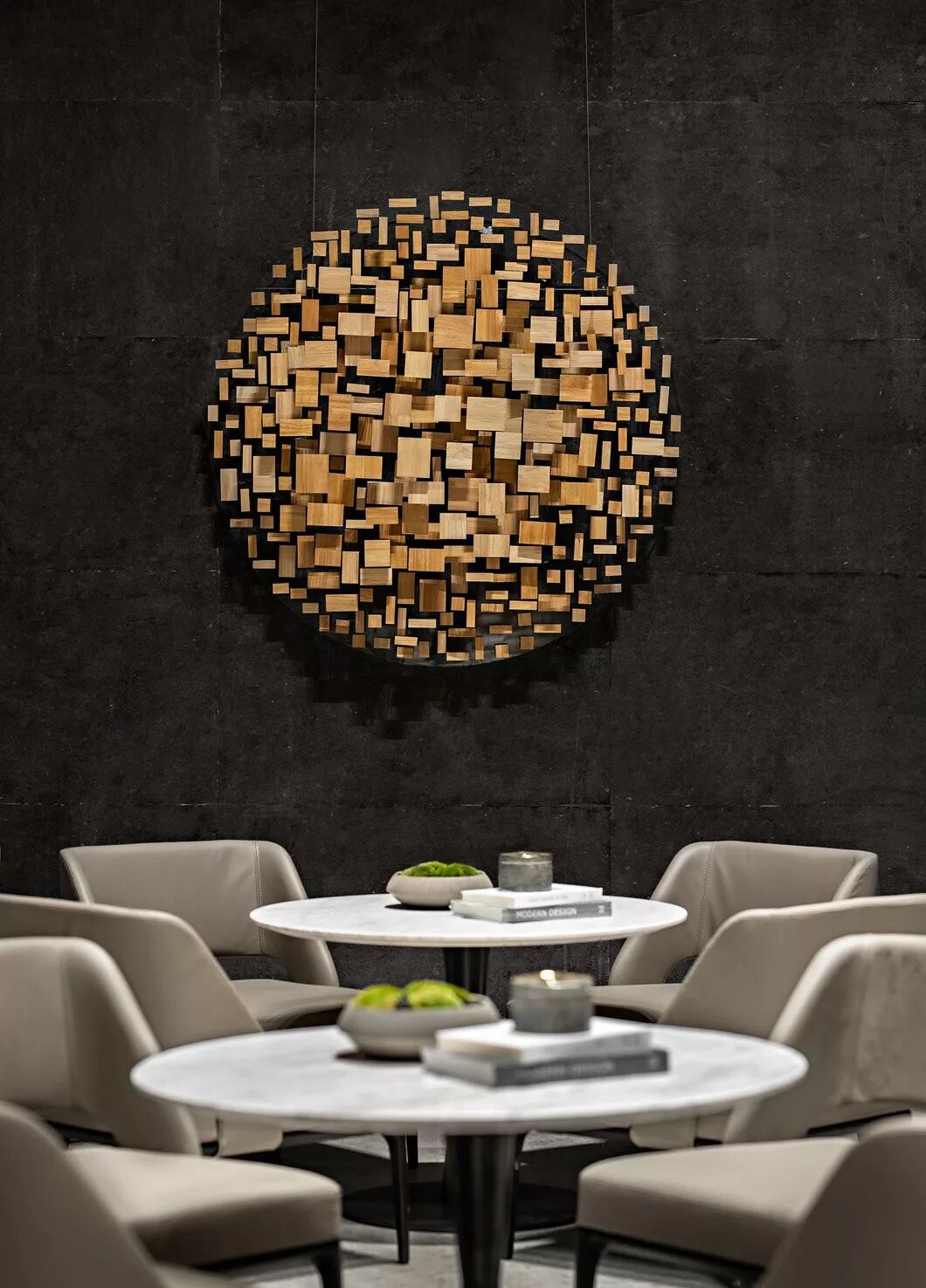 在物欲横流的都市中,“从简”的当代思潮从小众渐渐进入主流,然而它的根基却十分牢靠地植根于热爱生活人们的心中。雕塑在墙上开出大自然的花朵,将最具生态表现力的“木”与售楼处中的现代陈设相结合,寓意着大自然与现代和谐发展。