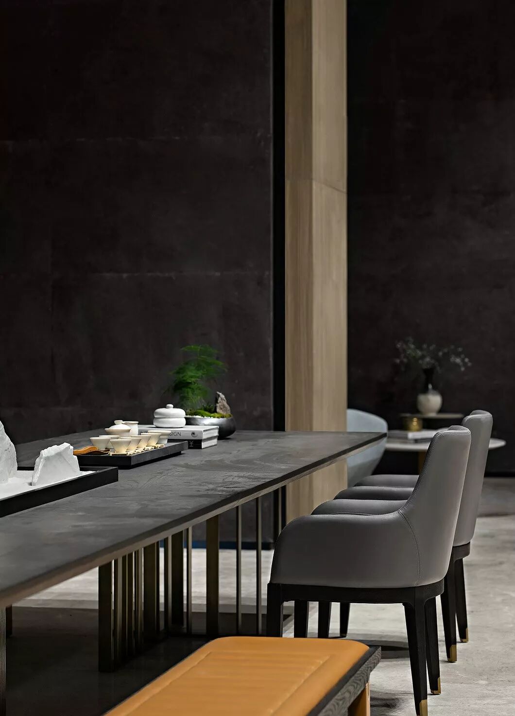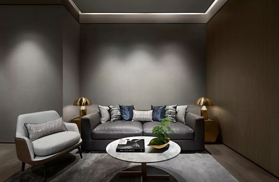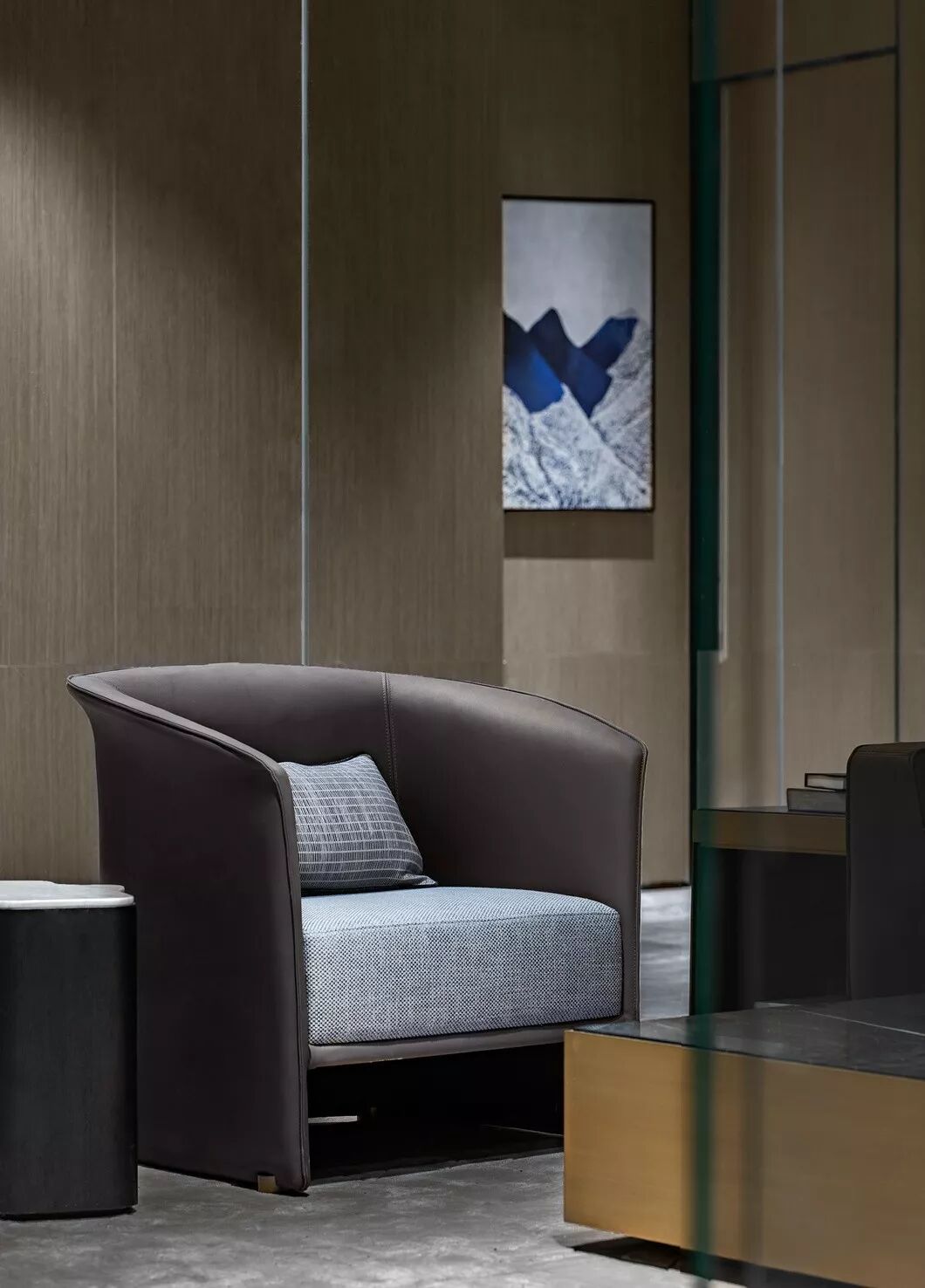 致广大而尽精微,在小处领略微妙的含义。洽谈区的设计以简洁有序的空间布局、清冷简约的石材、淡雅而节制的素色沙发,搭配相得益彰,自然的形态描述出生动的仪式感,所选用意大利Minotti品牌家具,注重舒适度及设计感的双重呈现。