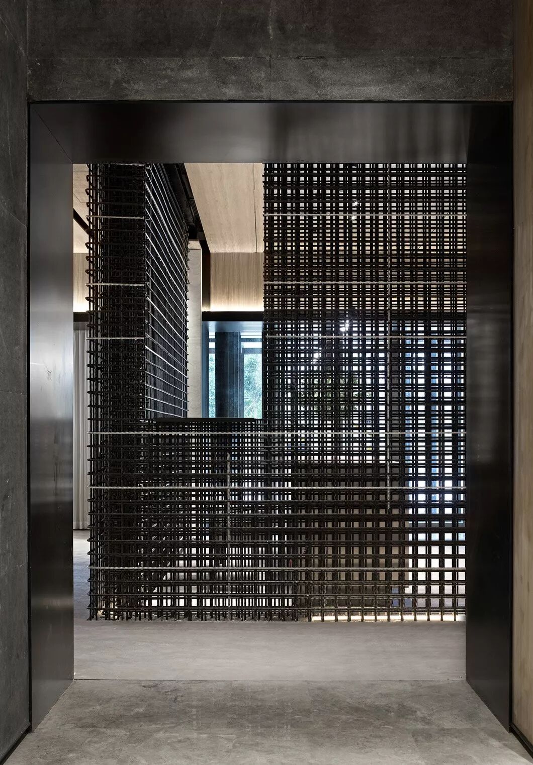 每一条线都经过精心设计,横线的平稳,竖线的冷静,纵横织就了现代空间的节奏感。与之对比的是背景墙上的大幅铁桥摄影的线条发散出的张力。