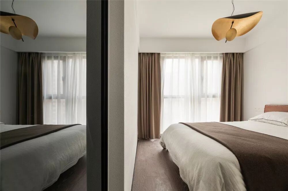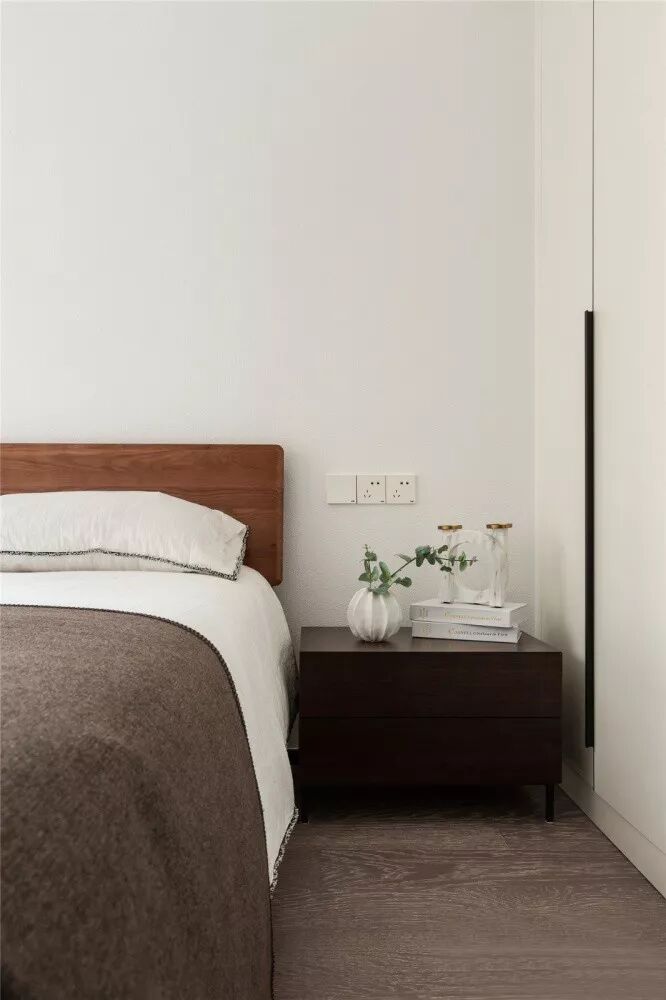 ▲ 次卧依旧选择白色为硬装色调,黑色硬包大床协调空间黑白配比,让空间在视觉上更为和谐舒适。