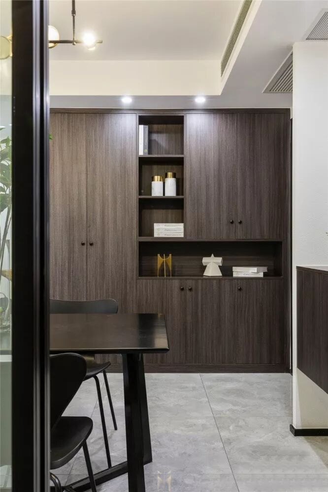 ▲ 餐厅另一边的排柜“有藏有露”,既满足屋主的收纳需求,又起到展示及装饰作用,温润木制在整个黑白空间中也带有“刚中带柔”的寓意。