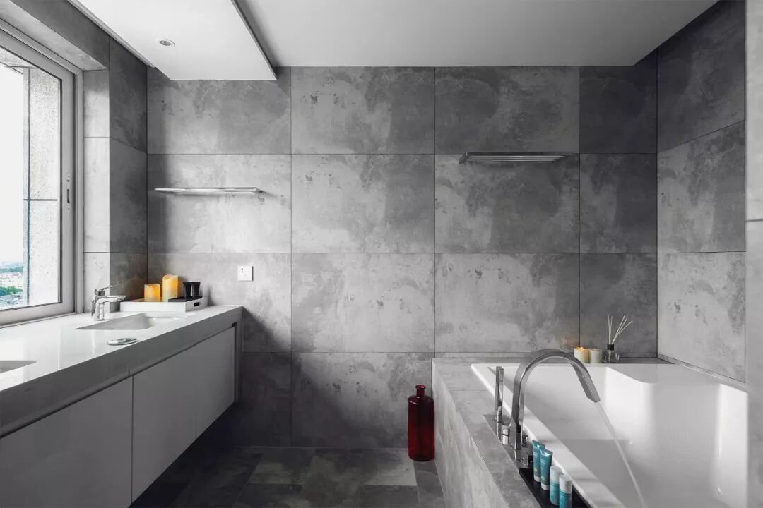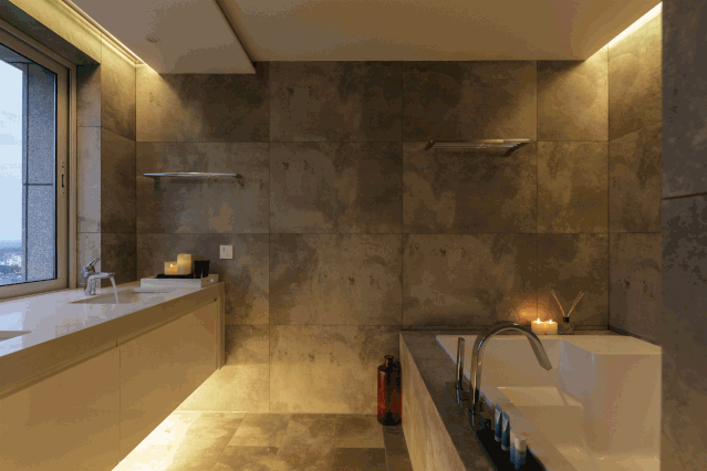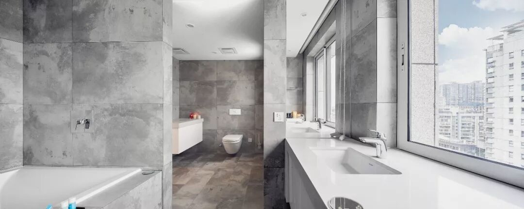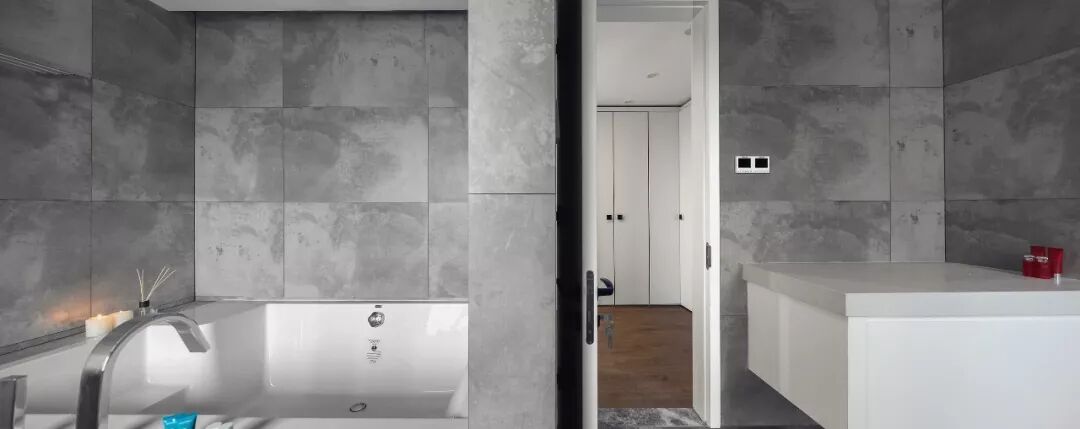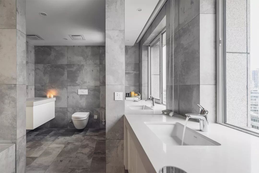 卫生间不仅有双人浴缸、双台盆配置,改良后的窗户与洗手台面自成一体,视线可远眺南京美丽的秦淮河……这里的白天,城堡灰的墙面与户外天光交相辉映,神游片刻,一朵俏皮云便不知何时溜进了房间;
