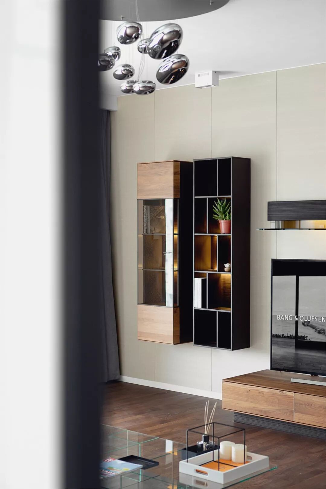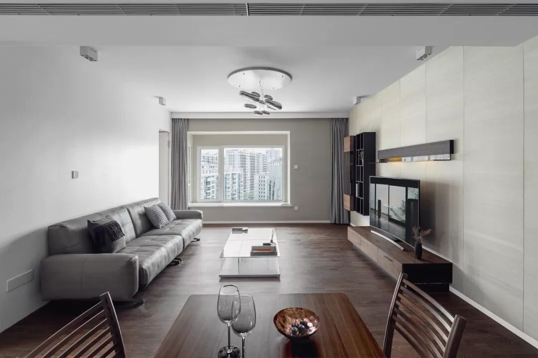 主体家私来自德系品牌,稳重内敛的胡桃木,银灰色真皮沙发,丹麦的无缝拼接的地板,亦暖亦冷的色系像是与生俱来的搭配。
