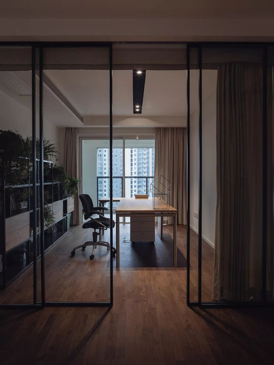原本敦实的墙体置换成无地轨的玻璃推拉门,书房的外部是一个开放式的休闲阳台,关联的不同空间有了对话。