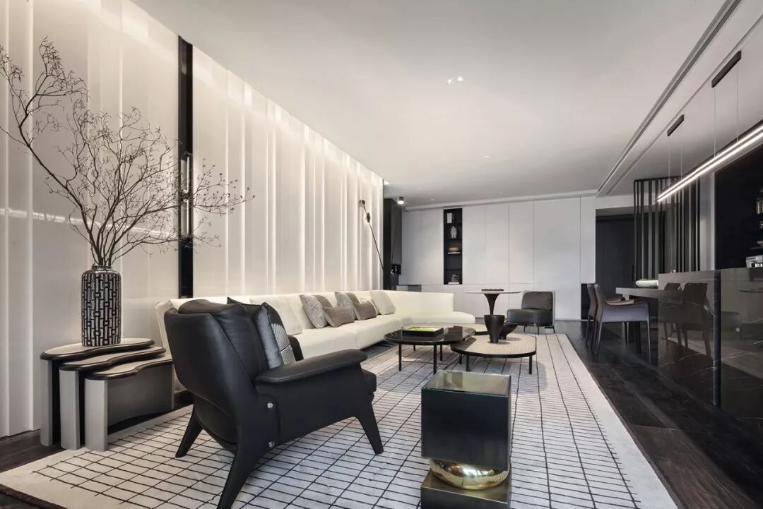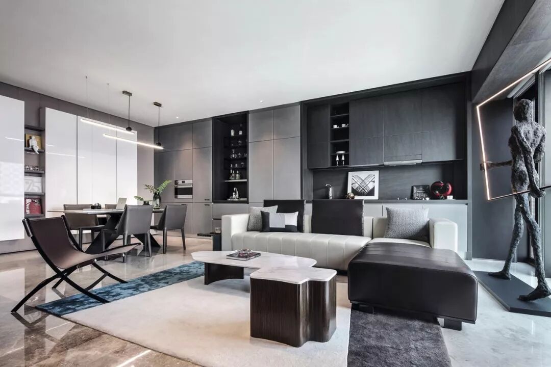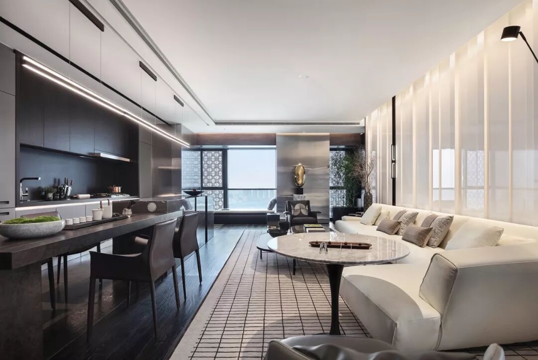 新光大 A 户型样板间在项目定位时,秉承“少则得、多则惑” 的极简主义理念,因为追求过多东西,往往什么也得不到,一切从简反而更充实,这使得最新设计干净而又大气。