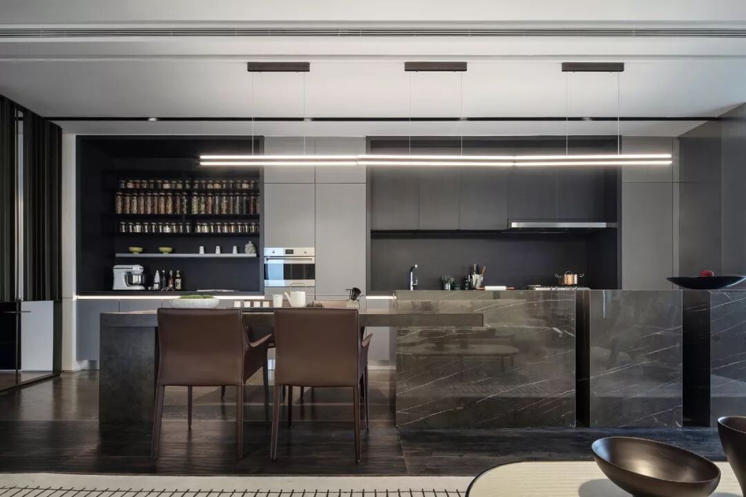 设计师利用低调精英阶层对色彩的敏锐视角,以格调的的绅士灰为主色调,配以优雅白,稳重咖,加以点缀爱马仕橘。低奢和感性于不经意间传达至每一处,也让空间有着不同韵律的过渡。