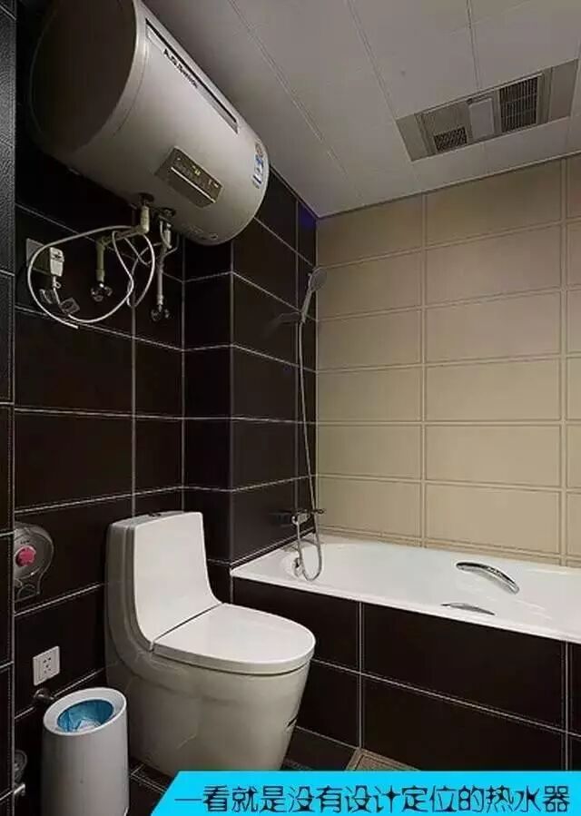 3、热水器:在装热水器时一定要注意和门的距离,这样开门关门会比较方便,另外热水器要装的高一些,这样在视觉上还是非常整洁的,热水器装在房梁上还是更加安全。像下图这样就是太低了,应该达到上图红线的位置更加稳固。