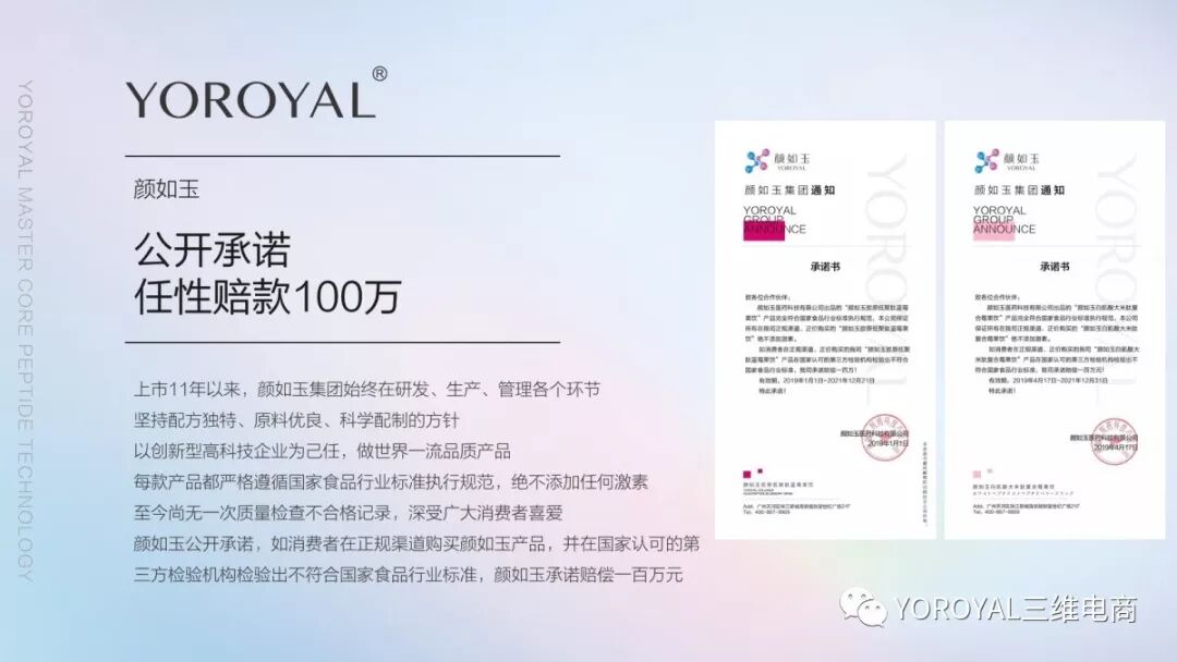 颜如玉公开承诺,如消费者在正规渠道购买颜如玉产品,并在国家任何的第三方检验机构检验出不符合国家食品行业标准,颜如玉承诺赔偿100万元人民币。
