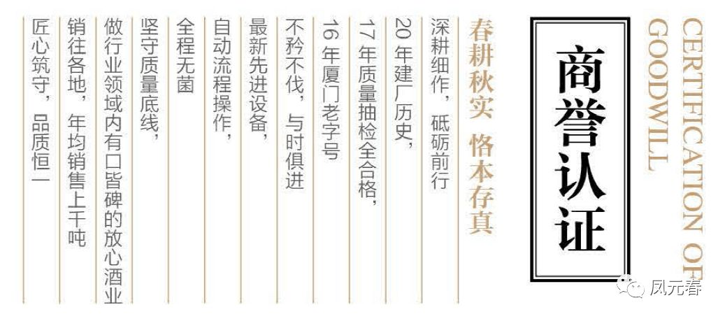 厦门凤元春酒业有限公司,前身为厦门市集美区辉记老酒坊。始创于1998年,2000年搬至蔡塘,占地1000平方米。2005年厂址迁至集美后溪至今,公司员工20余人,规模扩至2000多平方米。17年购置最新先进设备,全自动流程操作、全程无菌;全自动流水灌装系统,一个小时可达上万瓶,总投资200余万人民币。