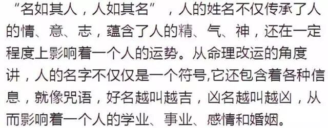 “先天命理不足,后天来补”。从命理改运的角度讲,通过取名改名从而达到改运助运旺运的目的,是行之有效的途径。而从姓名角度讲,姓名数理的暗示诱导力确实对人生有各种影响。有的人因姓名数理不善,或常患病体弱;或不管如何努力,总不能缔结良缘;或终生努力而无所成就;或感觉不论做何事总不顺利,似乎世间万事万物都在与其做对为难。总之,一个人姓名的好坏吉凶,将关乎个人的人生发展,关乎命运的走向和富贵吉凶。